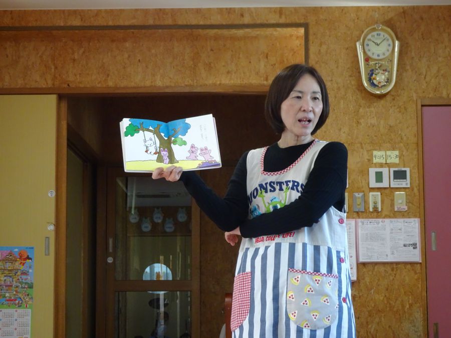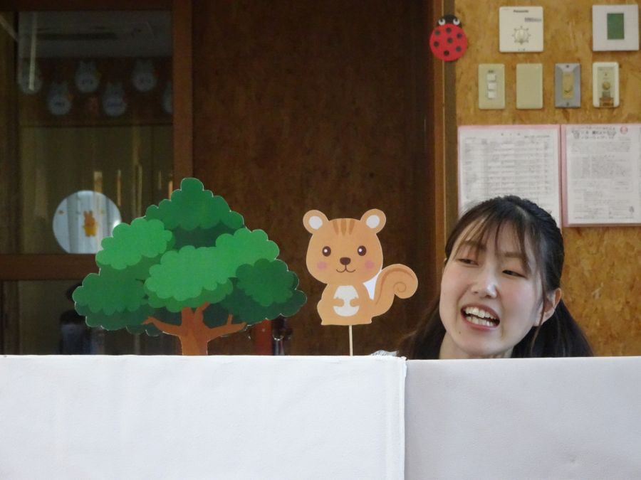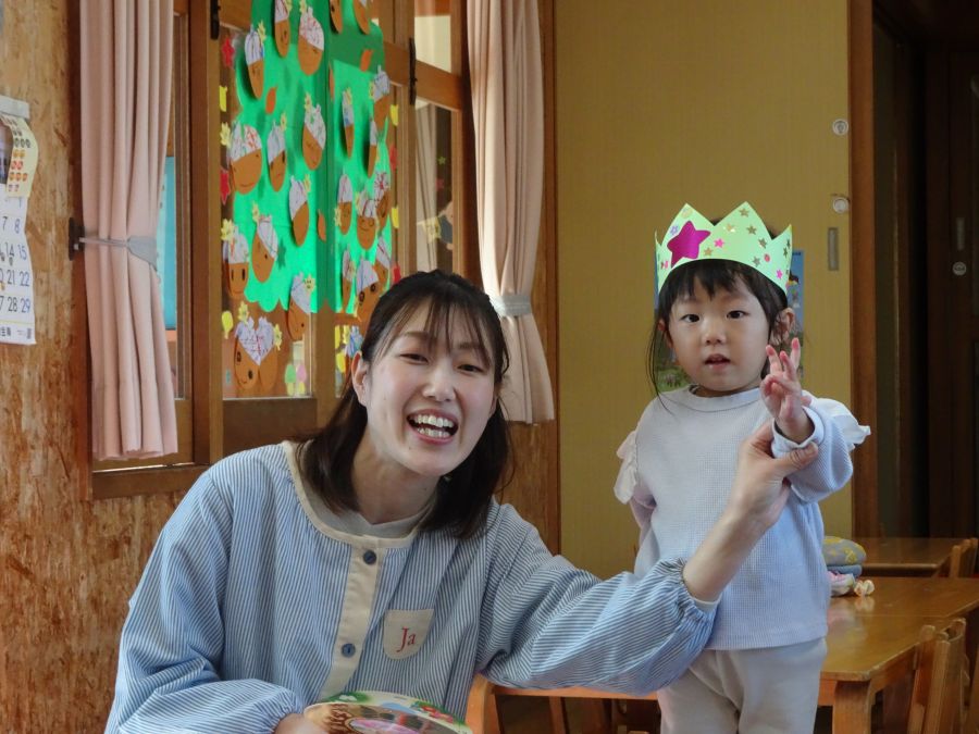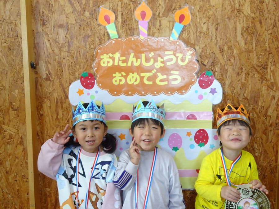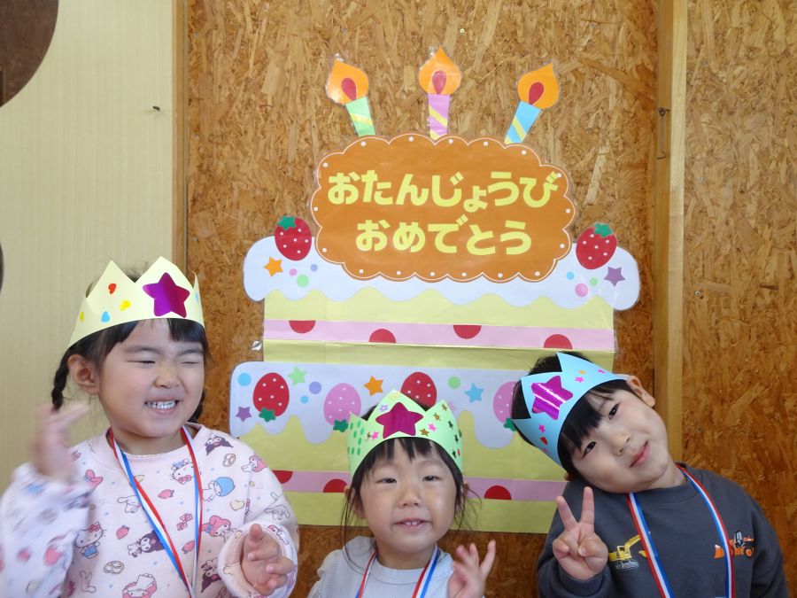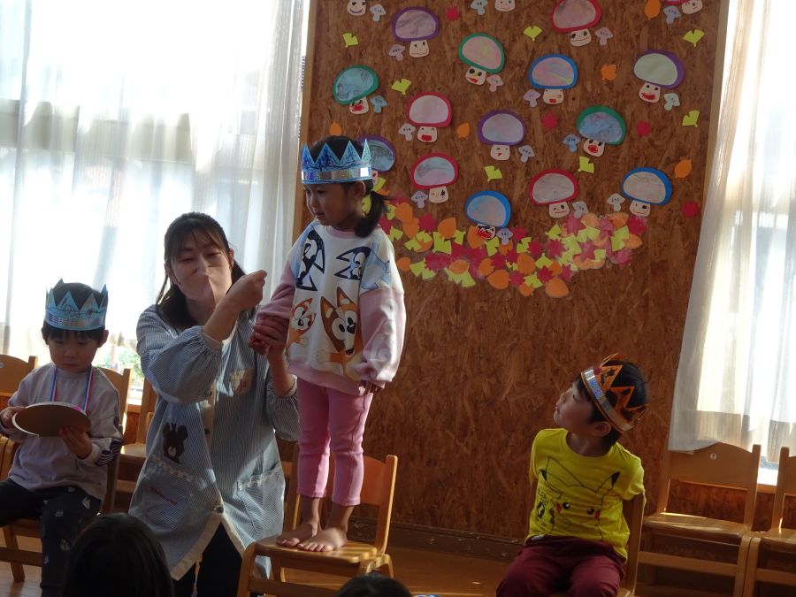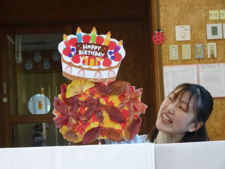 2025年11月21日(金) 11月生まれの誕生会(3歳・未満児) 11月生まれのお友達、お誕生日おめでとう! 「あきのかくれんぼ」のペープサートを見ました。 木の影に隠れているのは誰かな?とクイズをしました。どんぐりやりすさんが出てきて、子どもたちは楽しんでいましたよ。落ち葉の中から誕生日ケーキも出てきて大喜びでした。 誕生日のお友達も緊張しながらも、インタビューに答えることができました。 絵本や、歌のプレゼントもあり、みんなでお祝いすることができました。 もどる