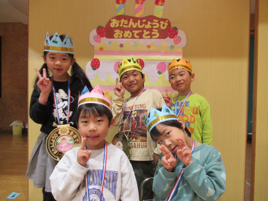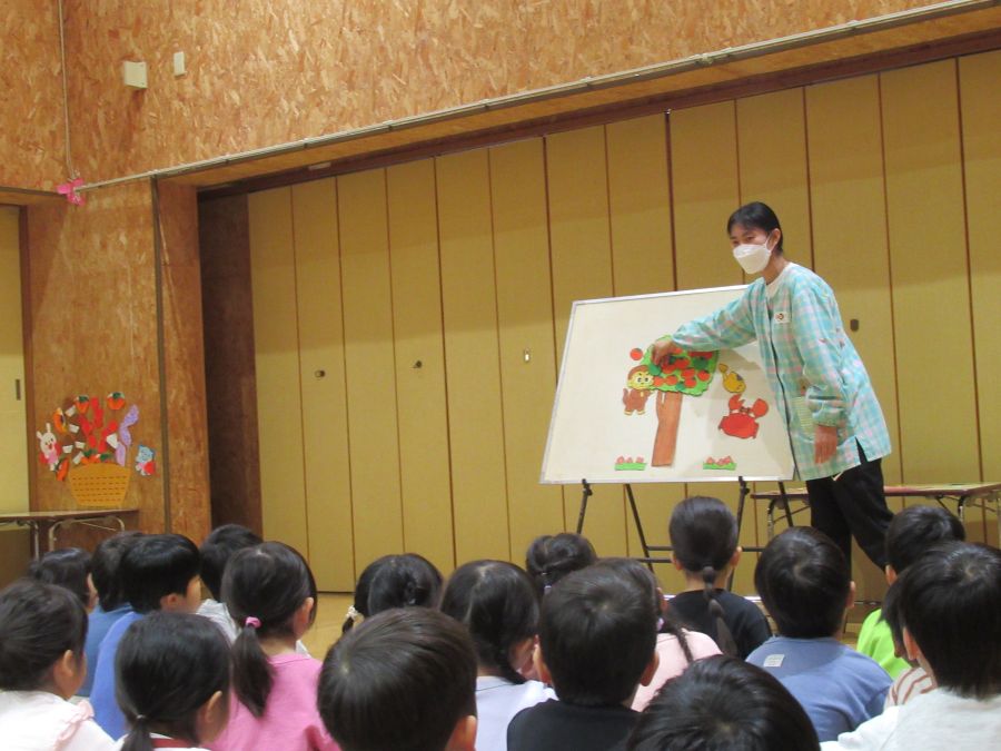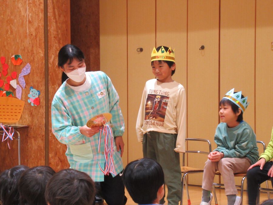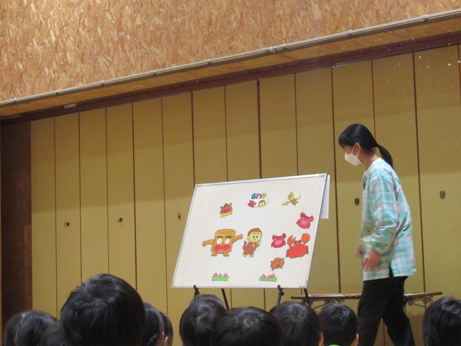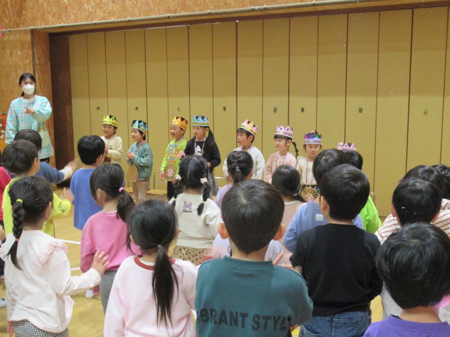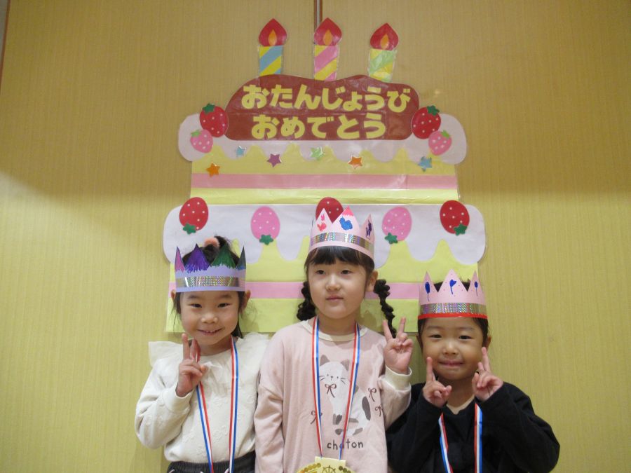 2025年11月21日(金) 11月生まれの誕生会(4・5歳児) 11月生まれのお友達、お誕生日おめでとう!! パネルシアター「さるかに合戦」を見ました。 知っている子が多く、楽しくみていましたよ。カニが、さるにいじわるされる時には、「かわいそう」という声も聞こえてきました。 誕生日の子へのインタビューでは、大きな声で答えることができました。 みんなからの歌のプレゼントや、「おめでとう!!」の声に喜んでいました。 もどる