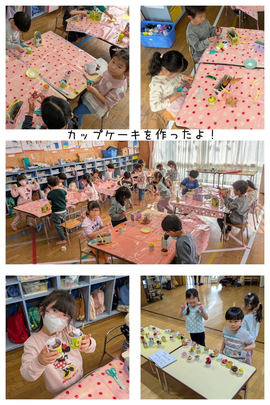 4歳児さんは、木の実や、葉っぱを使って遊びました。青組はどんぐりや、松ぼっくりを使い、カップケーキを作りました。「何味にしようかな?」「どんなものをのせようかな?」と考えながら楽しく作りました。みんなで作った物を並べて、ケーキ屋さんの開店です。 白組は、葉っぱに絵の具絵を付けて、スタンプをしました。指で葉っぱに色を塗り、ペタン!きれいに葉っぱの形になりました。葉っぱを組み合わせてハートや、ウサギなどの絵も作っていましたよ。
