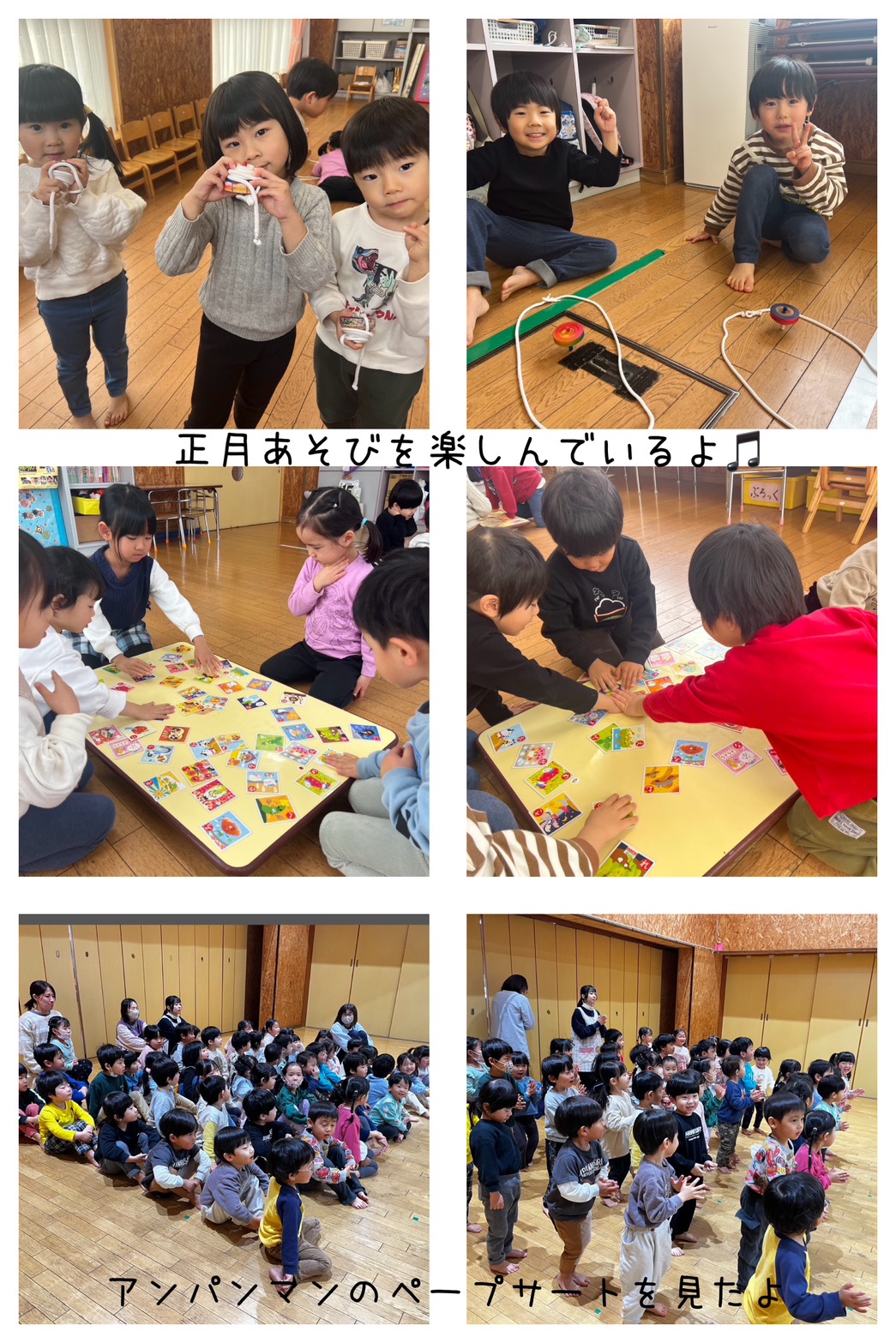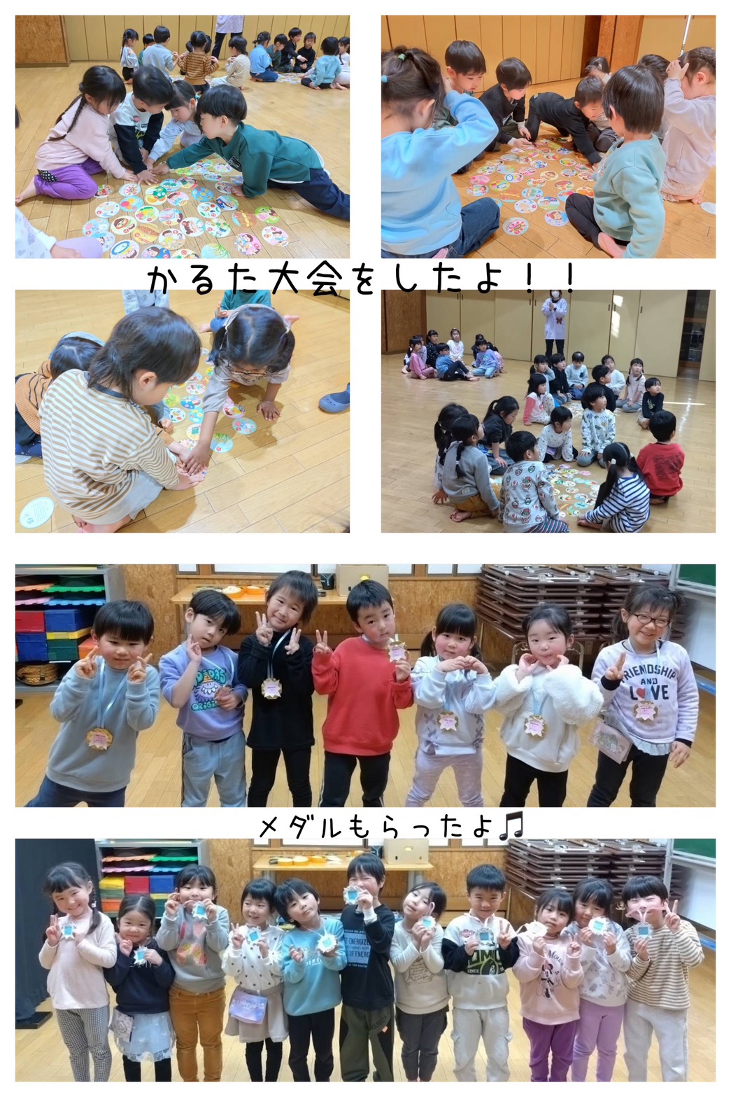 正月遊びでは、カルタやコマ遊びを楽しんでいます。3歳児さんは、絵を見ながら取ったり、コマも紐の巻き方から練習し、少しずつ回るようになってきました。出来たときには大きな声で「せんせー、まわった!!」と教えてくれます。4歳児は、カルタ大会を行いました。チームに分かれてその中でどれだけとれるか、競争しました。真剣に絵札と向き合い、絵や文字を見て、素早く取る姿がありました。