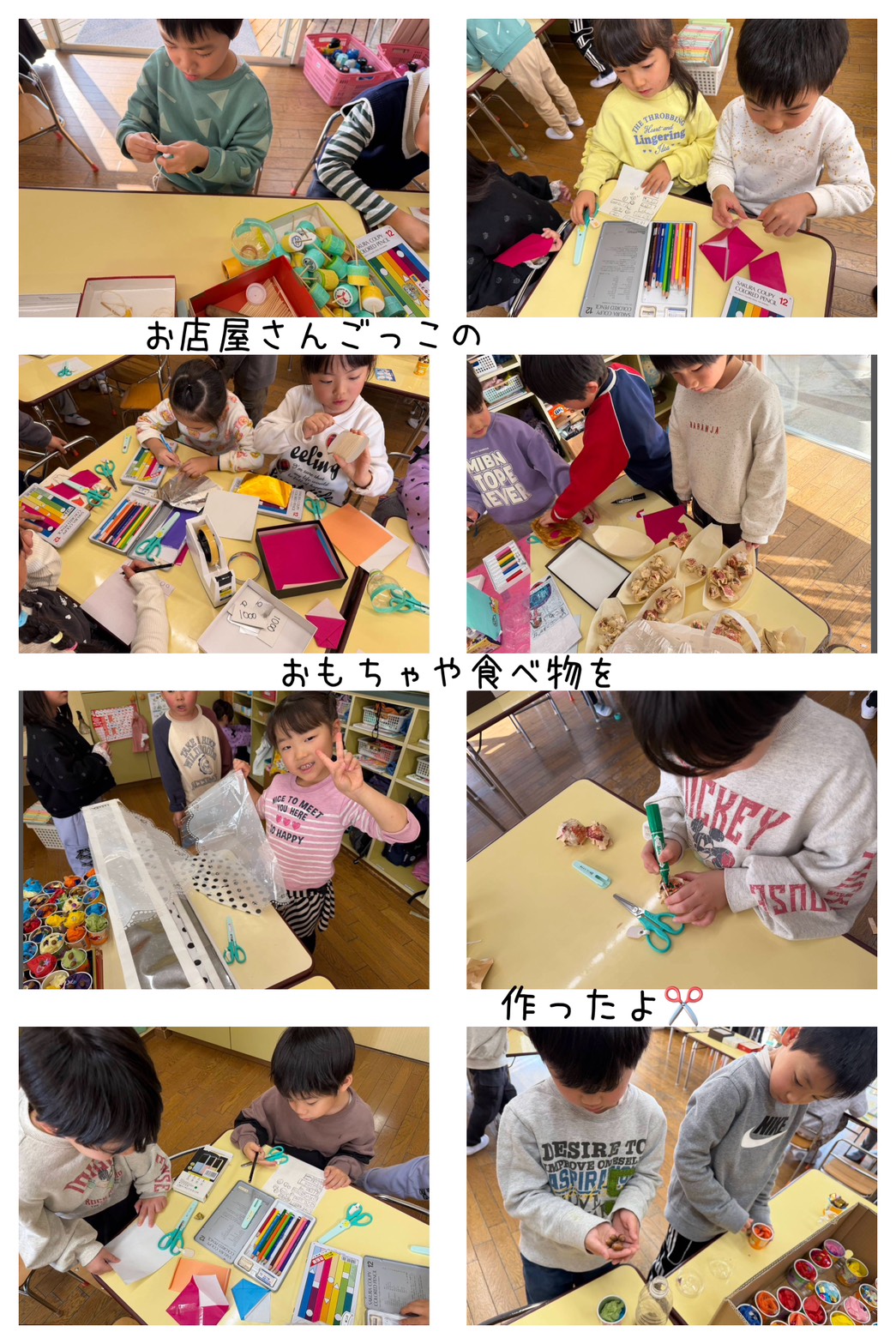 2月のお店屋さんweekに向けて、各クラスお店作りや、おもちゃ作りが始まりました。自分たちで、どんな絵を描こうか、どんなお店にしようか話ながら楽しく作っています。 おもちゃは、自分たちでも遊んでみて、回ったり、飛び出たりと、楽しく遊んでいますよ。お店屋さん当日には、たくさんのお客さんに買ってもらえるね。