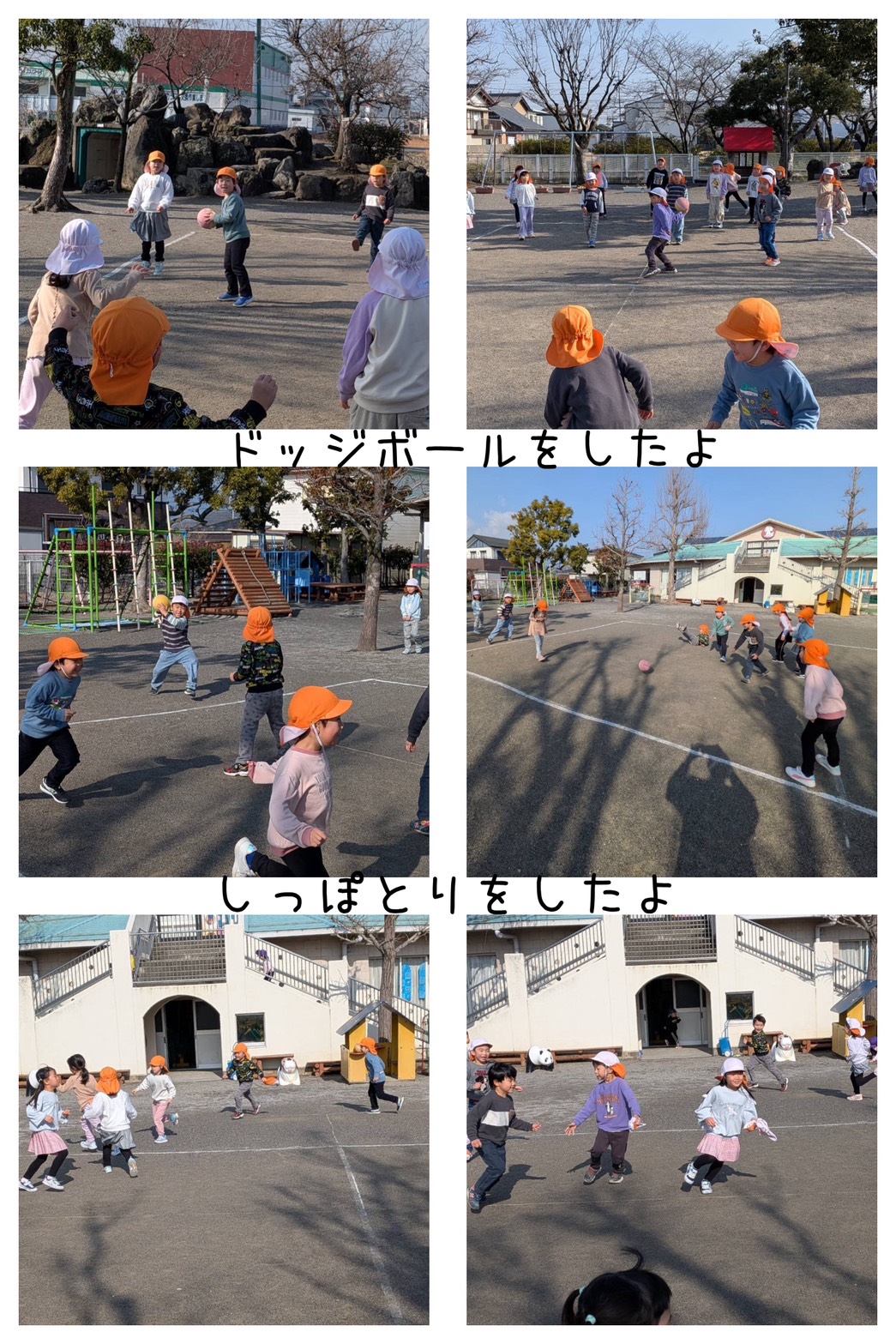 寒さに負けず、ドッチボールや、しっぽとりを行いました。チームに分かれて作戦会議をしてから、行いました。チームの為に勝とうと頑張り、応援する姿が多くありました。