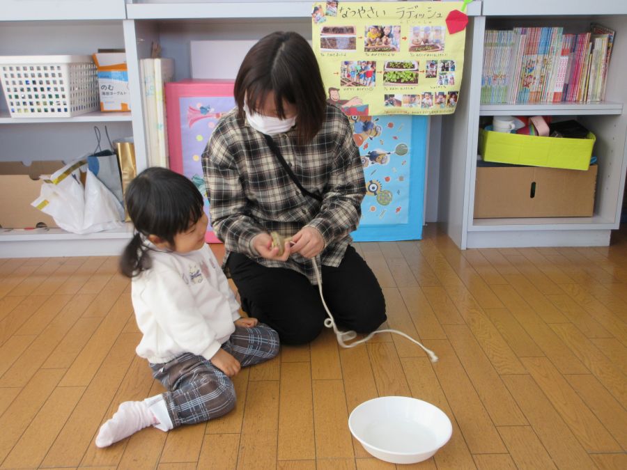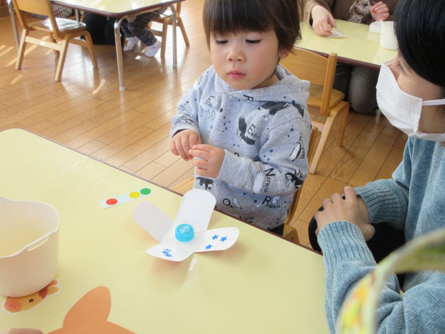 2026年01月21日(水) 第9回にこにこわんちゃんクラブを開催しました。 にこにこワンちゃんクラブを行いました。 今回は、正月遊びをしました。今年の干支の馬の福笑いや、コマを作りました。シールで飾り付けをしたり、目や人参を貼ったり、家族の人と楽しく作ることができました。作ったコマで遊んだり、保育園にあるコマに挑戦してみたり、楽しく遊びました。 もどる