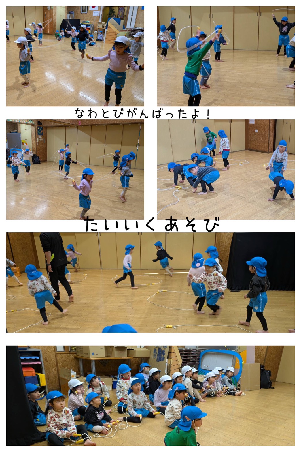 青組は体育遊びで、縄跳びに挑戦しています。前跳びの練習をし、少しずつ跳べるようになってきました。苦手な子も、あきらめず頑張っています。他にも縄跳びを使った遊びをして楽しんでいます。