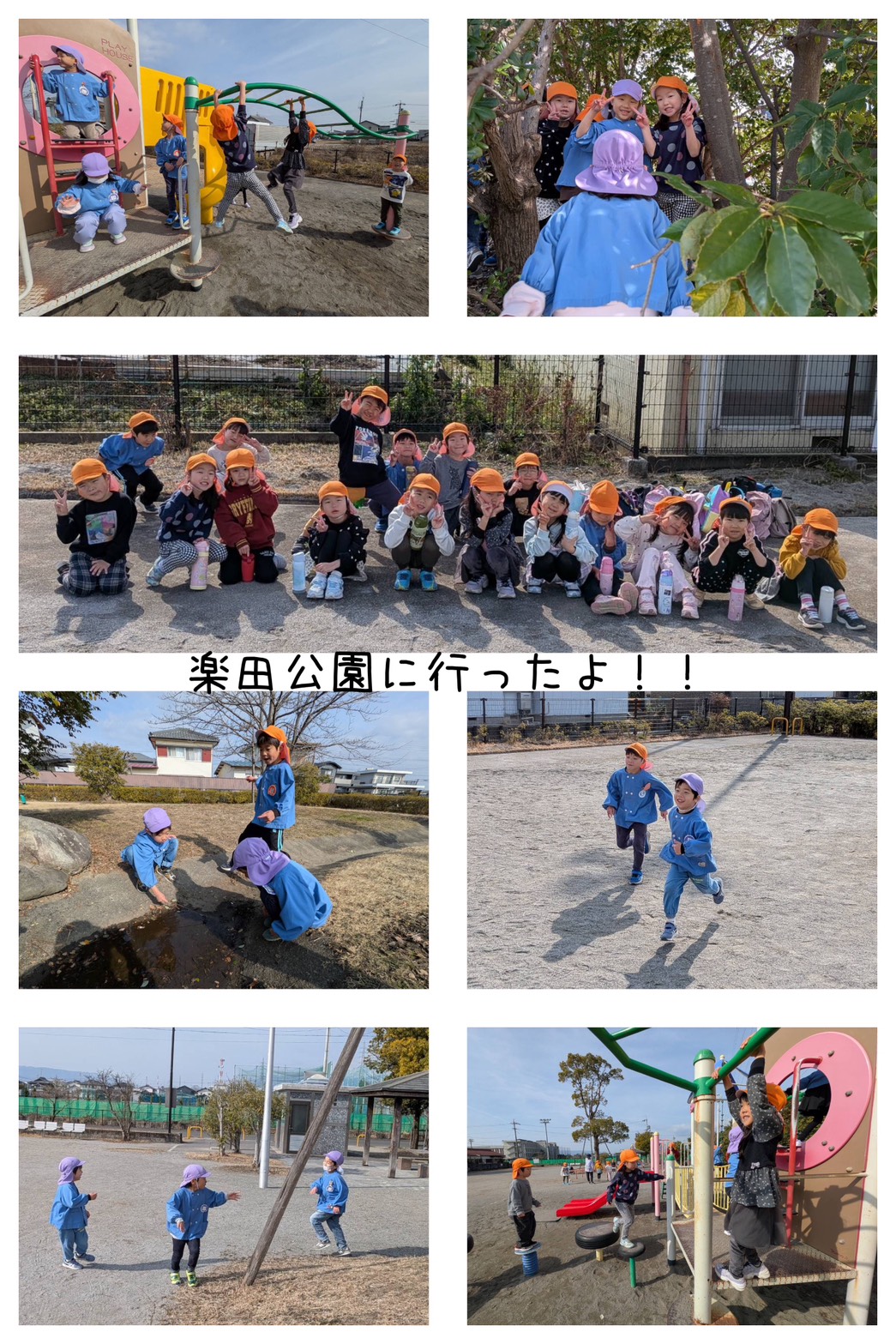 橙組、藤組で一緒に楽田公園まで、散歩に行きました。横断歩道を渡るときには、きちんと左右確認をして、交通ルールを守って安全に歩くことができます。 公園では、鬼ごっこをしたり、草花や、生き物を見つけたり、遊具で、友達と一緒に仲良く遊んでいました。帰り際まで思いっきり体を動かし、楽しく過ごすことができました。
