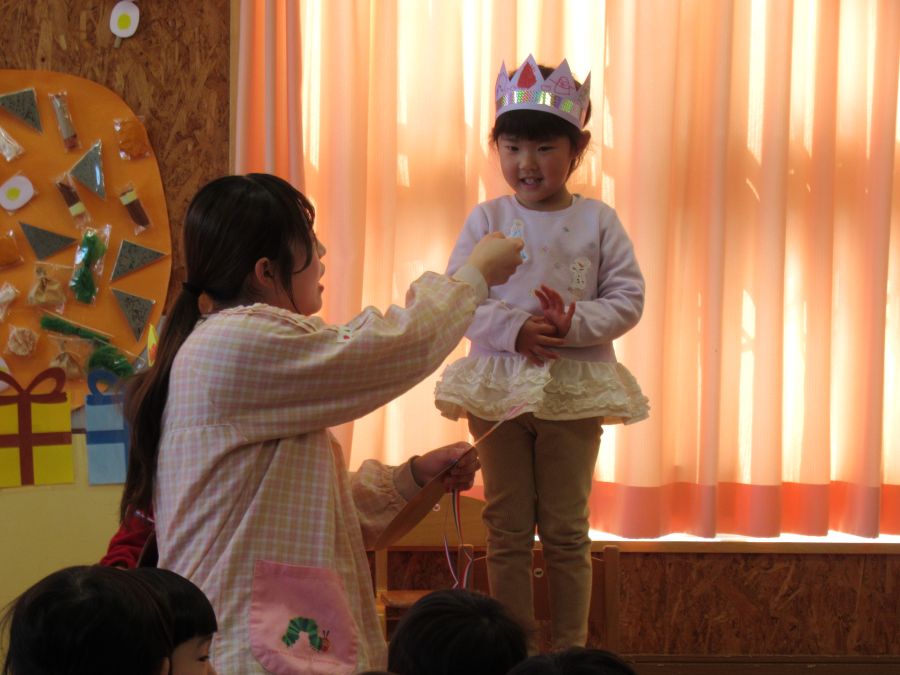 2026年02月17日(火) 2月生まれの誕生会(未満児・3歳児) 2月生まれのお友達 お誕生日おめでとう!! 先生からのプレゼントで、プレゼントボックスから動物や、ケーキが出てきました。ピンクの箱からは何が出てくるか当てたりしながら楽しく見ることができました。 誕生日の子は、恥ずかしがりながらもインタビューに答えることができました。絵本のプレゼントをもらいみんなから、お祝いしてもらい、大きくなったことを喜び合いました。 もどる