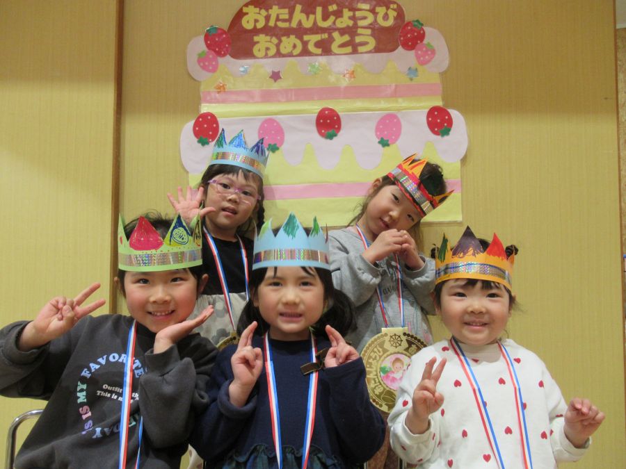 2026年03月12日(木) 3月生まれの誕生会(4.5歳) 3月生まれのお友達 お誕生日おめでとう!! 大きくなったら何になるかな?のクイズをしました。タケノコが大きくなったら何になるかなどちょっと難しい問題もありましたが、考えて答えていましたよ。 インタビューにもしっかり答えて、みんなからお祝いしてもらい、うれしそうでしたよ! また来年も、新しいクラスでお誕生日を、お祝いしてもらおうね!! 5歳児さんは、今回で最後ですが、これからもお友達と楽しく元気に過ごしてね!! もどる