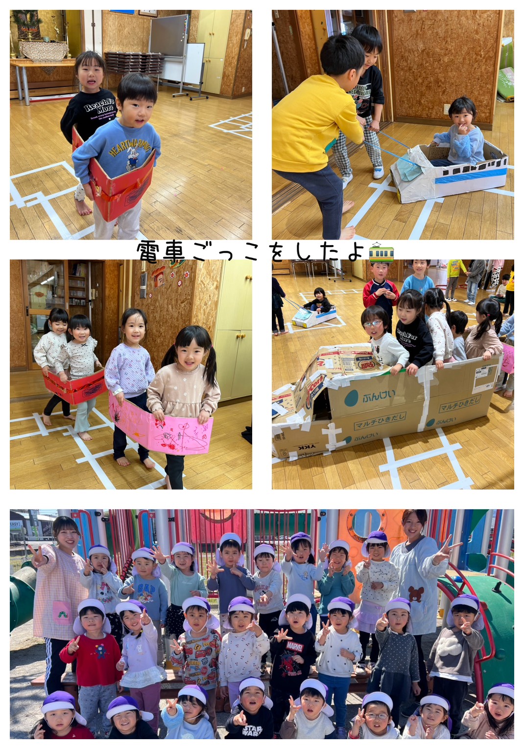 紫組さんは、ホールに線路ができていたため、電車ごっこをしました。5・4歳児さんが作った電車に乗り、走らせたり、電車を引っ張ったりと車掌さんになったりしながら、楽しく過ごすことができました。