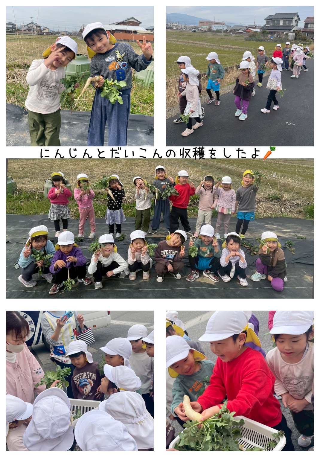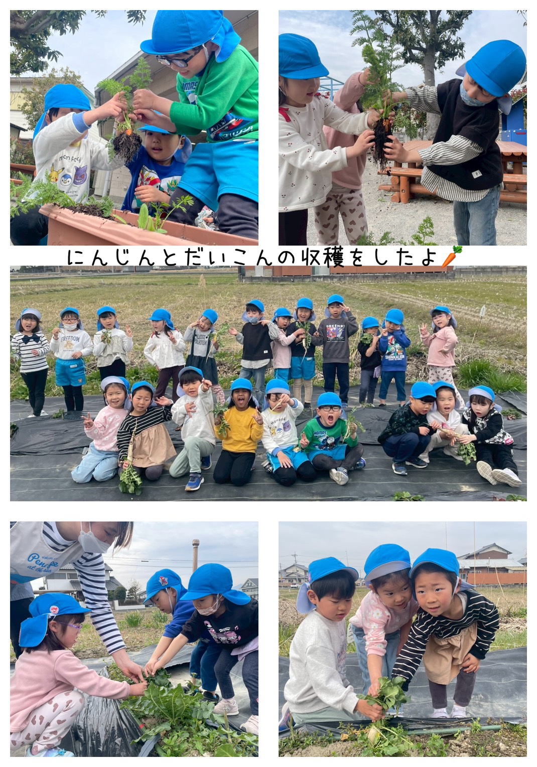 4歳児さんは、畑に植えた大根や、プランターのにんじんをどれだけ大きくなったか楽しみにしながら収穫しました。大きい物や細い物と色々な物があり、うれしそうに採っていましたよ。収穫した、にんじん・大根は給食で出て、美味しくいただきました。