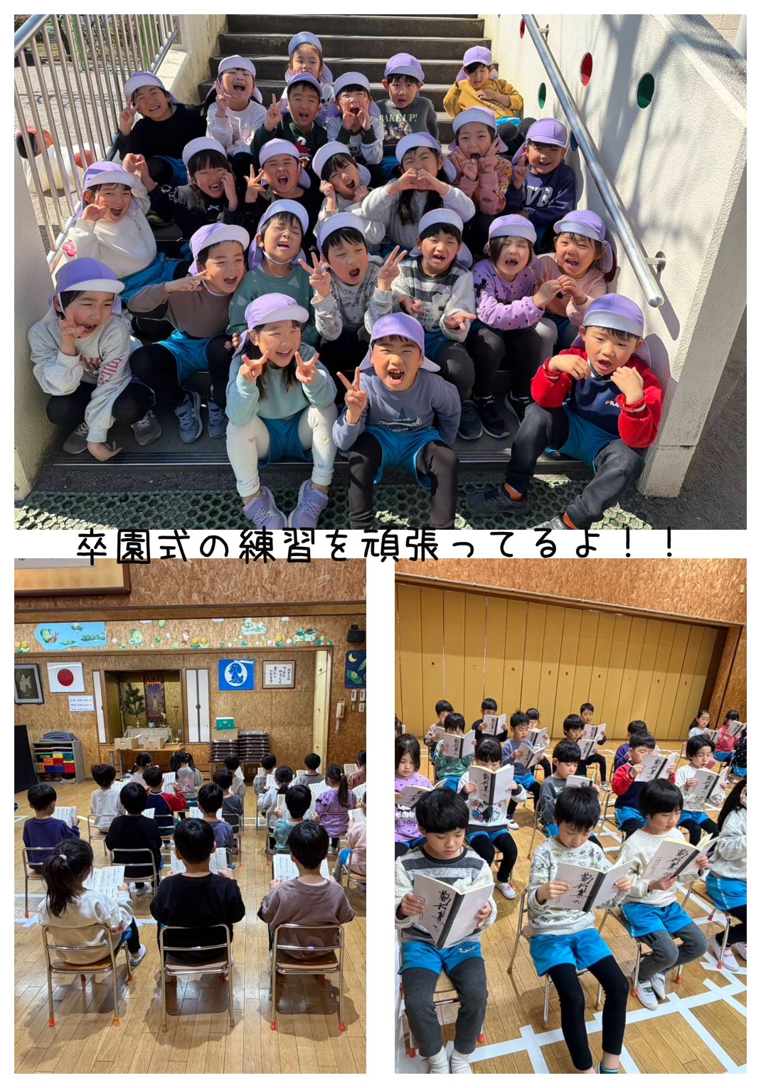 藤組さんは、卒園式練習を行いました。部屋で、証書のもらい方、言葉、お経等、練習を頑張りました。今まで過ごした保育園とももうすぐお別れ。さみしさと、次への期待をもっています。