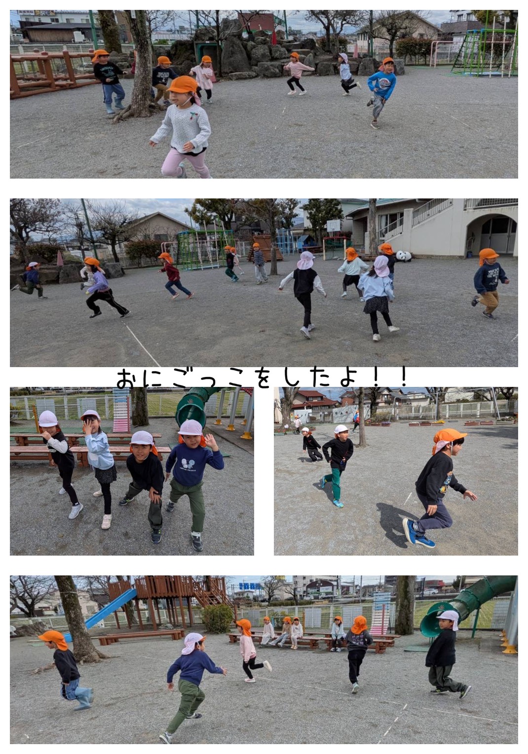 橙組さんは、みんなで鬼ごっこをしました。みんなで出来る集団あそびもあと少し。全力で、遊びを楽しみました。次は何して遊ぼうかと次の遊びも計画しながら、楽しみました。