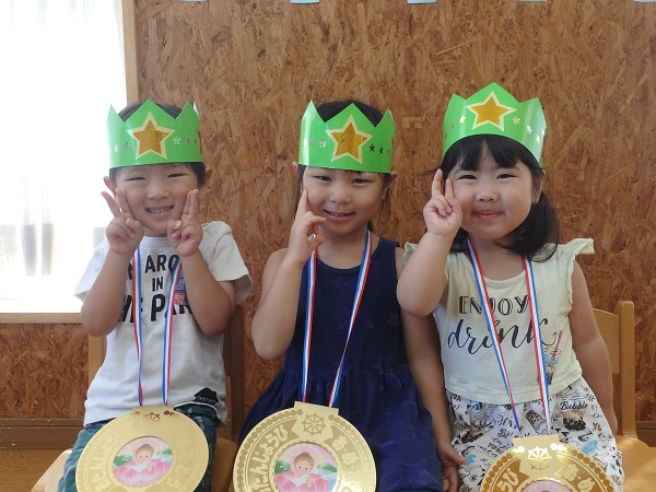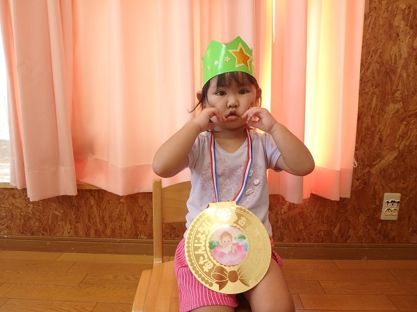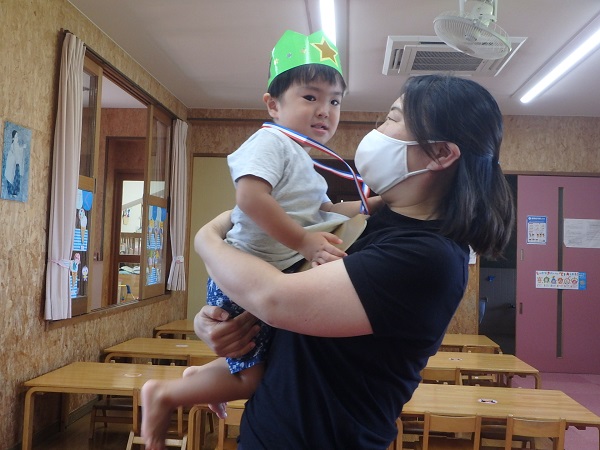 2020年08月31日(月) 8月生まれの誕生会(未満児・3歳児) お誕生日おめでとう!! 各クラスで、インタビューを行いました。 大きな声で、好きな食べ物や、お友だちを教えてくれましたよ。 クラスのみんなからは、歌のプレゼント!! その後には、竹中先生からの抱っこ・くるくる回るプレゼントをしてもらい、嬉しそうでしたよ。 もどる