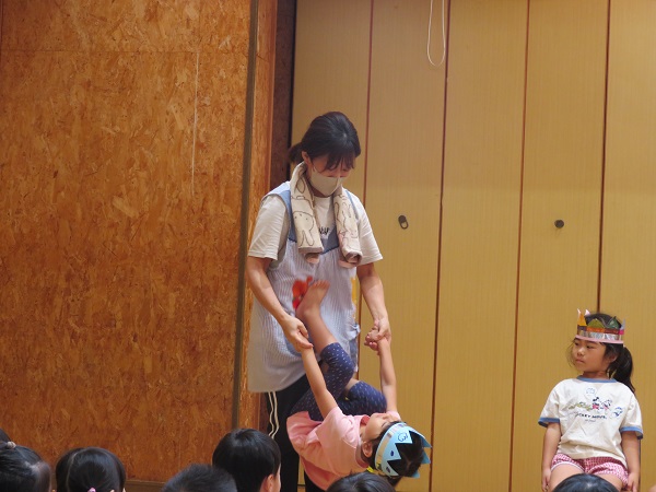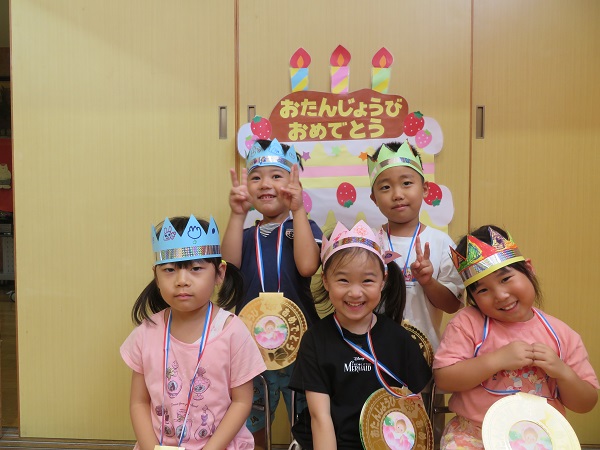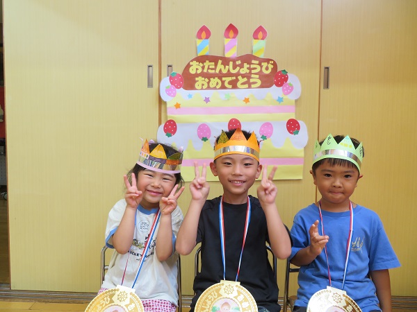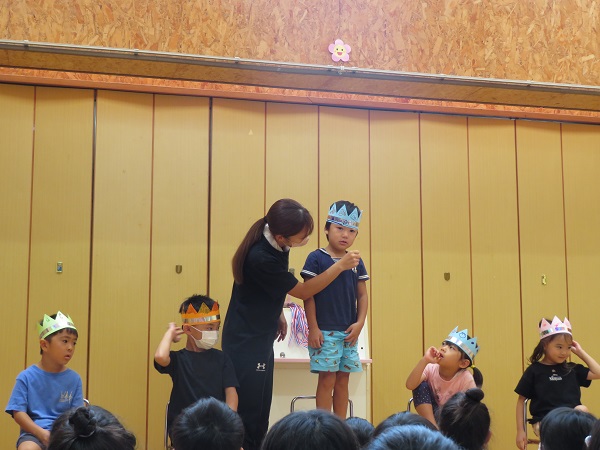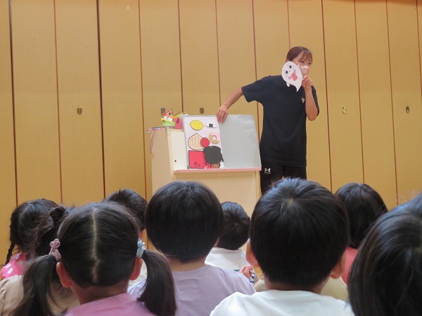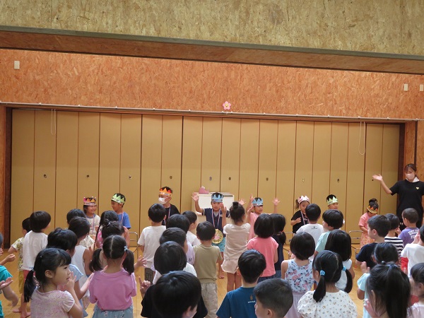 2023年08月28日(月) 8月生まれの誕生会(4・5歳児) 8月生まれの子、お誕生日おめでとう!! 今回は、『くいしんぼうのおばけの子』のペープサートを見ました。 色々な形を見て、冷蔵庫の中身を当てるクイズをしました。 食べ物が出てきた瞬間に元気よく答える姿が、たくさん見られました。 インタビューでは、元気に答えることができたね! もどる