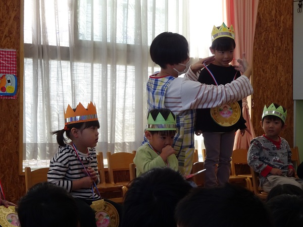 2023年10月30日(月) 10月生まれの誕生会(3歳児・未満児) 10月生まれの子、お誕生日おめでとう!! 「わたしはだあれ?」のペープサートを見ました。 帽子から見えた足や体を見て、「うさぎ!」「きりん!」などと元気よく動物の名前を答えていました。 インタビューでは、恥ずかしがりながらも頑張って答えることができたね! もどる