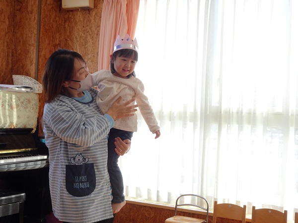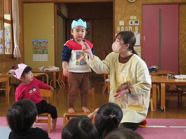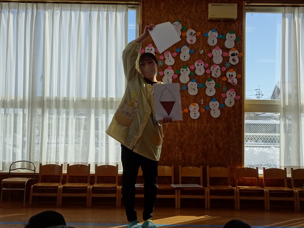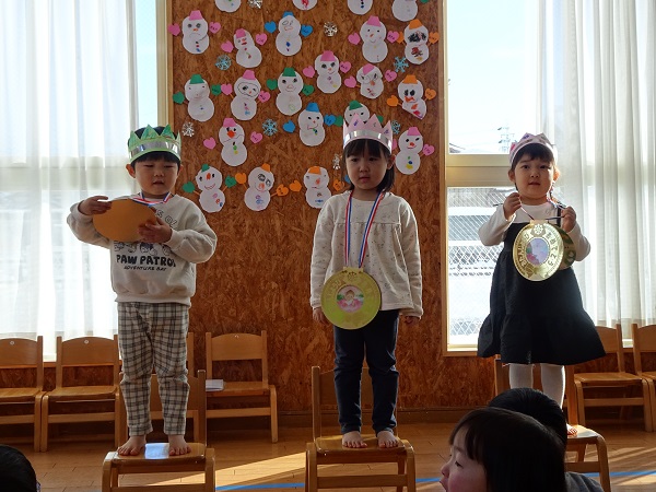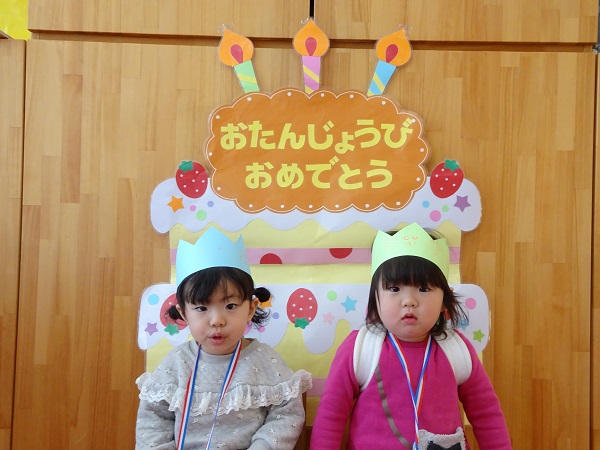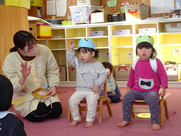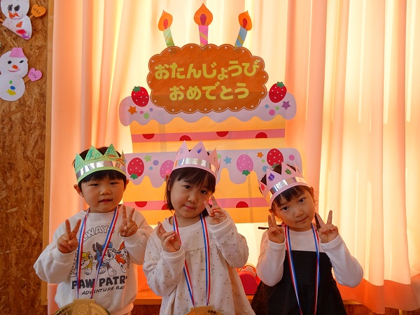 2024年01月25日(木) 1月生まれの誕生会(3歳児、未満児) 1月生まれの子、お誕生日おめでとう!! 「〇、△、□クイズ」をしました。少しずつ見えてくるヒントを頼りに、何の絵が出てくるか考えて答えていました。正解すると喜んでいましたよ。 インタビューも元気よく答えることができました! もどる