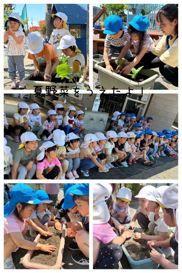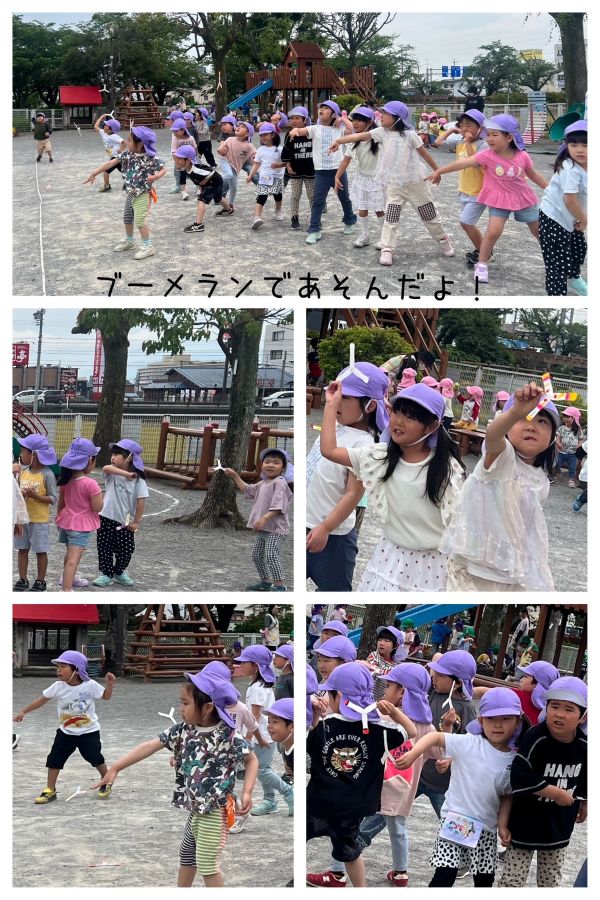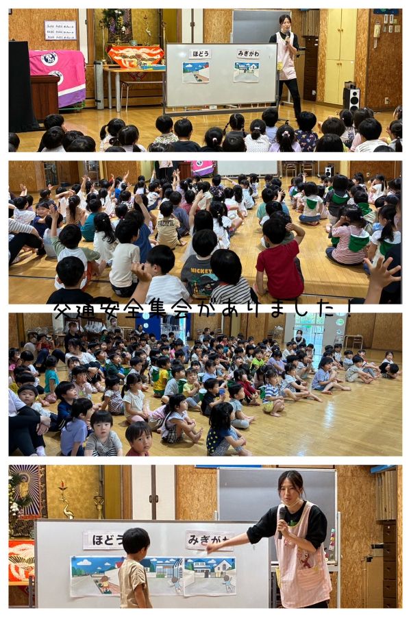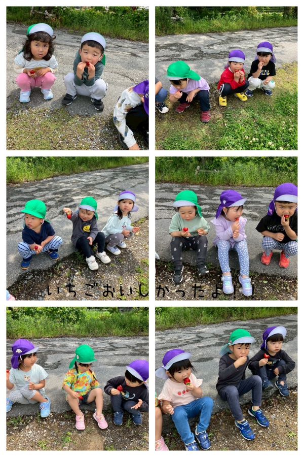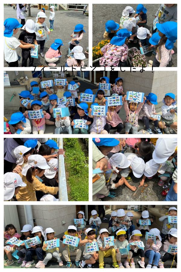 2025年05月19日(月) 保育園の1日 3歳児は、みんなで一緒にいちご狩りをしたり、自然の花や、生き物を探したりしながら、楽しく過ごしました。 4歳児は、フィールドビンゴで、園庭を探索し、友達と協力して、いろんなものを見つけました。 5歳児は、初めてケーキカラーを使って色を塗ったり、紙スプーンでブーメランを作り、みんなで飛ばして遊びました。 交通安全集会では、道路の歩き方を教えてもらいました。 交通ルールを守って歩きましょう!! もどる