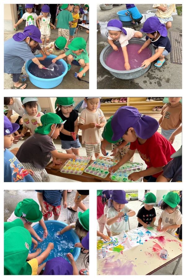 3歳児さんは絵の具を凍らせて、氷絵の具で絵を描きました。 氷が解けていく感覚を感じながら、いろんな色でお絵描きを楽しみました。
