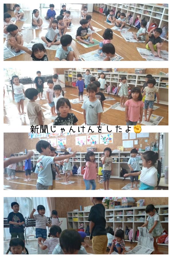 白組さんは新聞じゃんけんをしました。負けてしまうと、どんどん新聞が小さくなる中、最後まであきらめず楽しんでいましたよ。