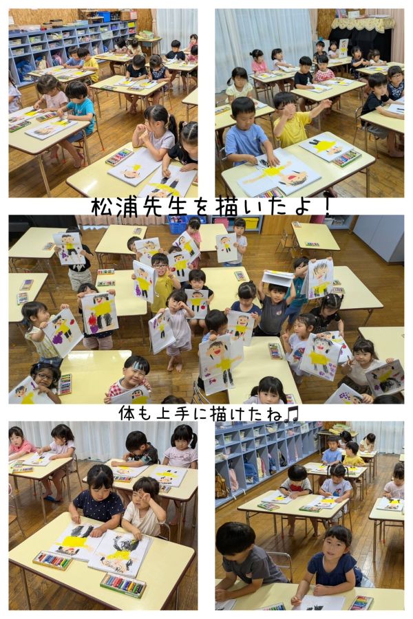 青組さんは、担任の先生を見ながら全身を描きました。顔は、どんな風かな?手はどこから出ているかな?など観察しながら上手に描くことができました。