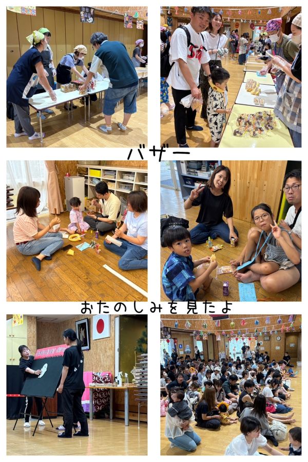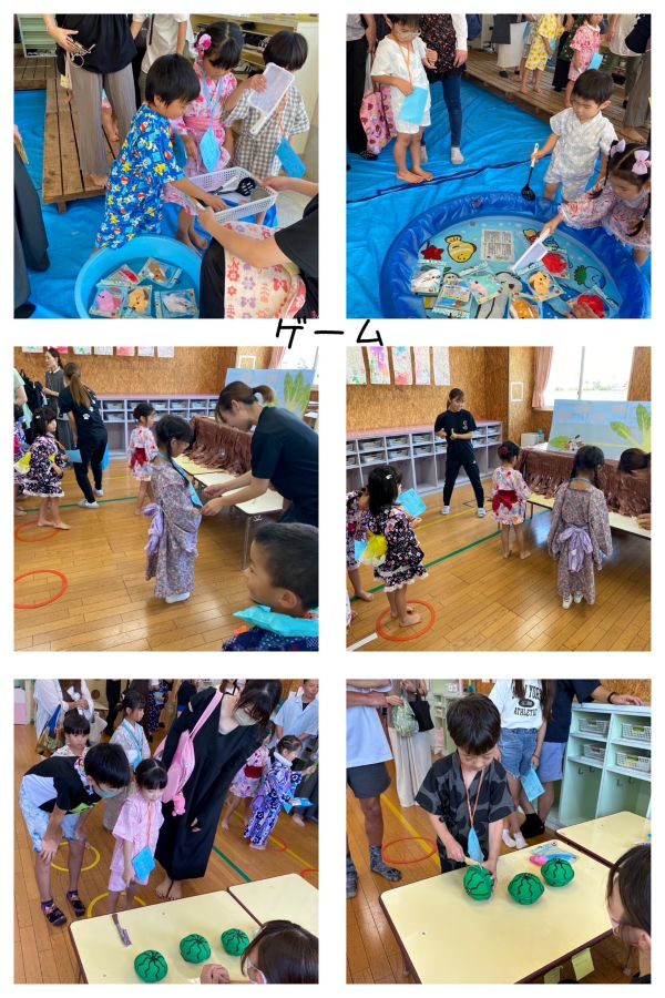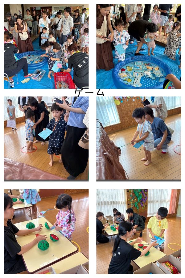 ゲームではかぶを引っ張って、シャボン玉をもらったり、すいかを切ってお菓子をもらったり、おもちゃを水の中からすくったり、家族みんなで楽しみました。