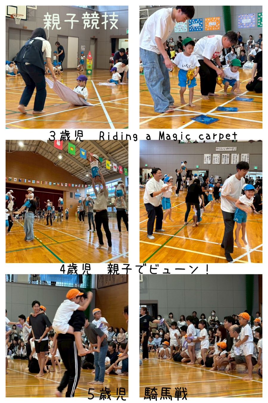 親子競技では、保護者の方に引っ張ってもらったり、音楽に合わせて楽しく踊ったり、協力して帽子を取ったり、保護者の方と触れ合いながら、楽しく行うことができました。