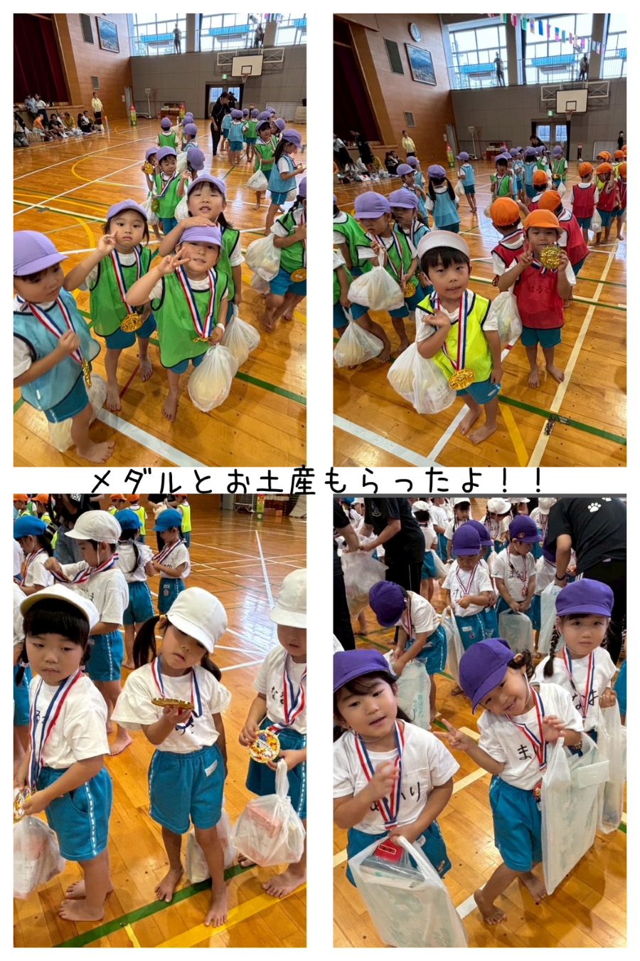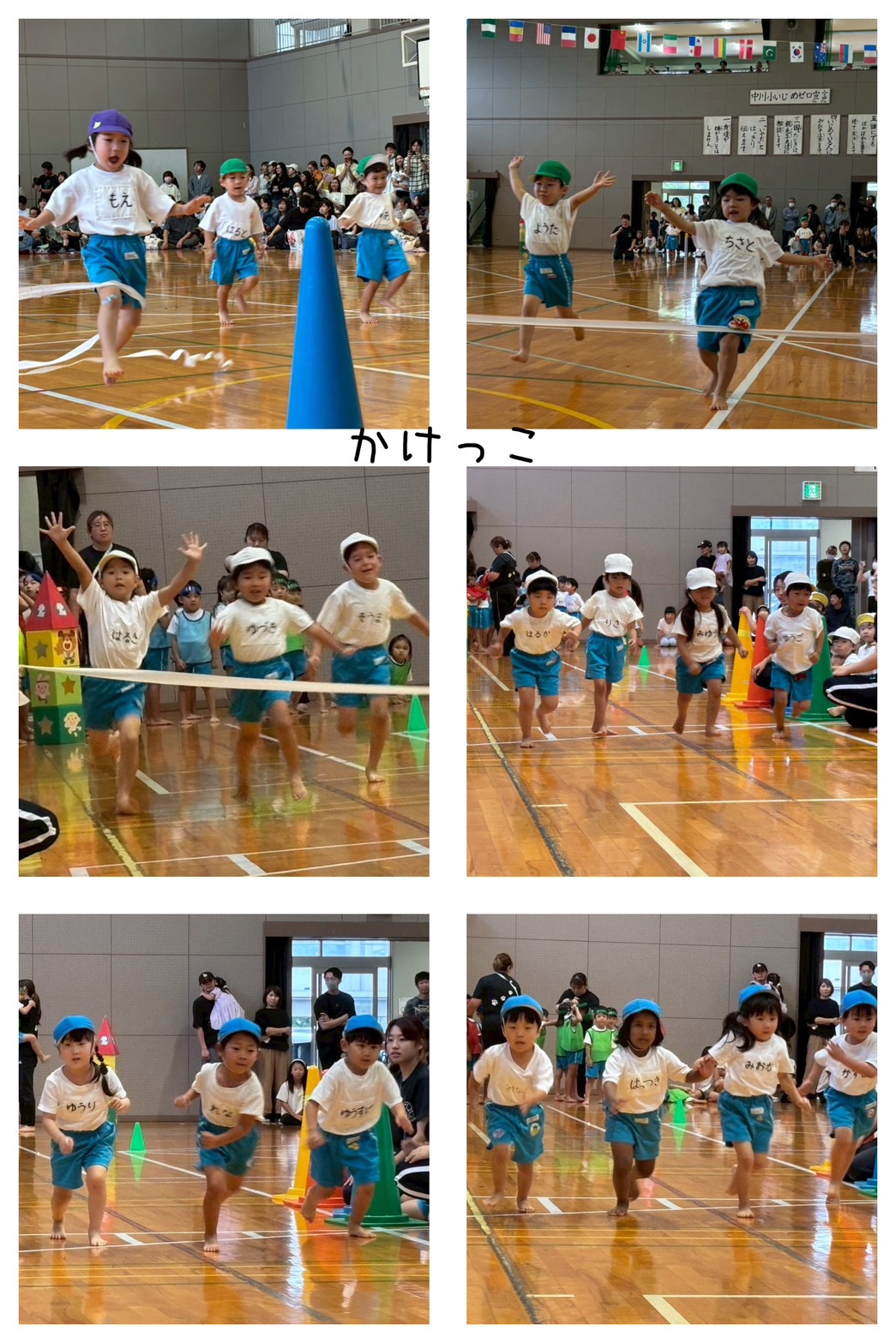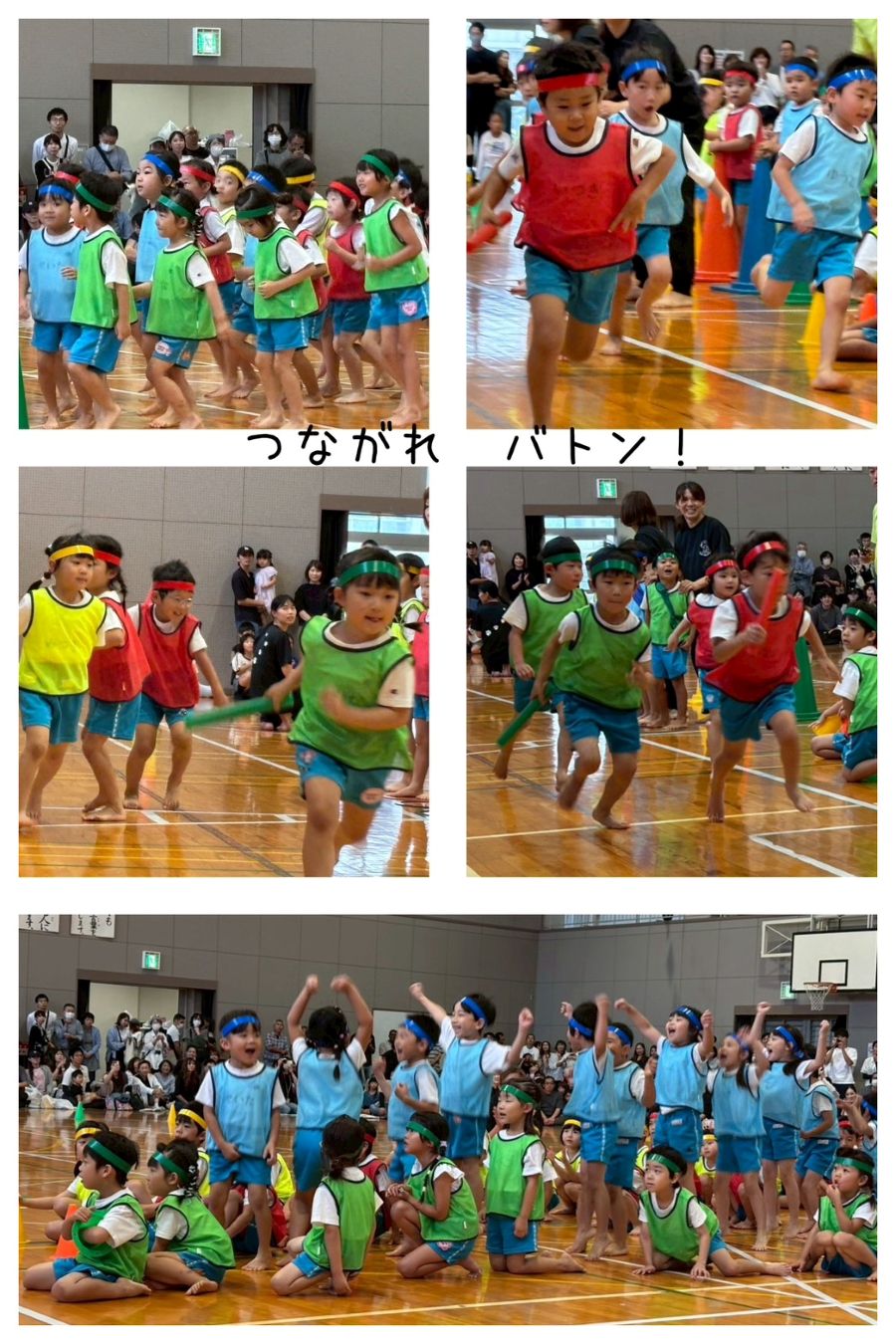 最後に3・4歳児のかけっこ・5歳児のリレーで盛り上がりました。友達とゴールを目指して一生懸命に走り、隣の子に負けないよう手を振り速く走ろうとしたり、チームで協力してバトンを繋ぎ応援し、1位を目指したり、歳児ごとに一生懸命走りやりきることができました。