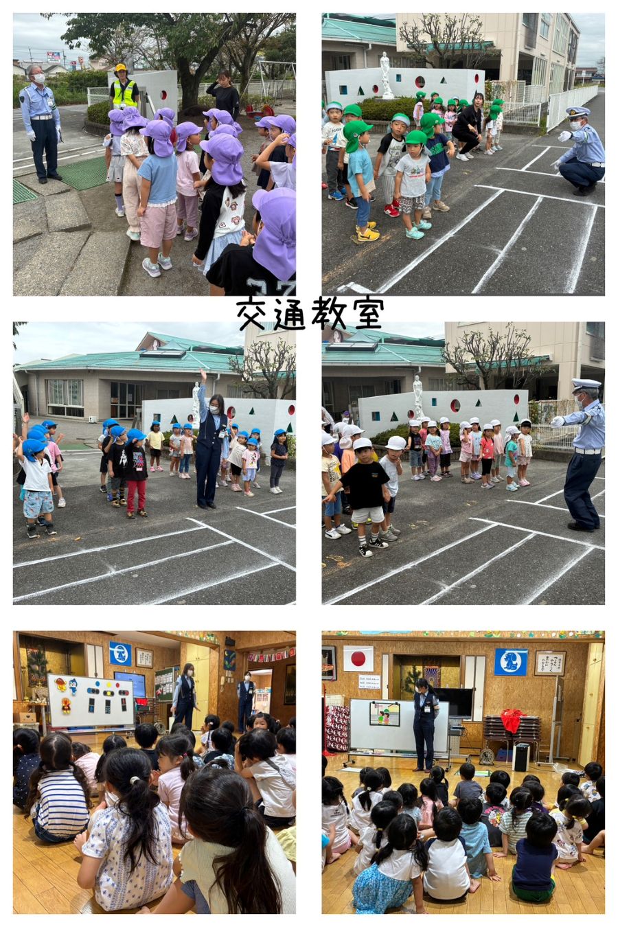 市の交通課の方に来ていただき、交通教室を行いました。キャラクターを使って、分かりやすく交通ルールを教えていただいたり、実際に横断歩道を渡りながら、左右確認の大切さを確認していきました。