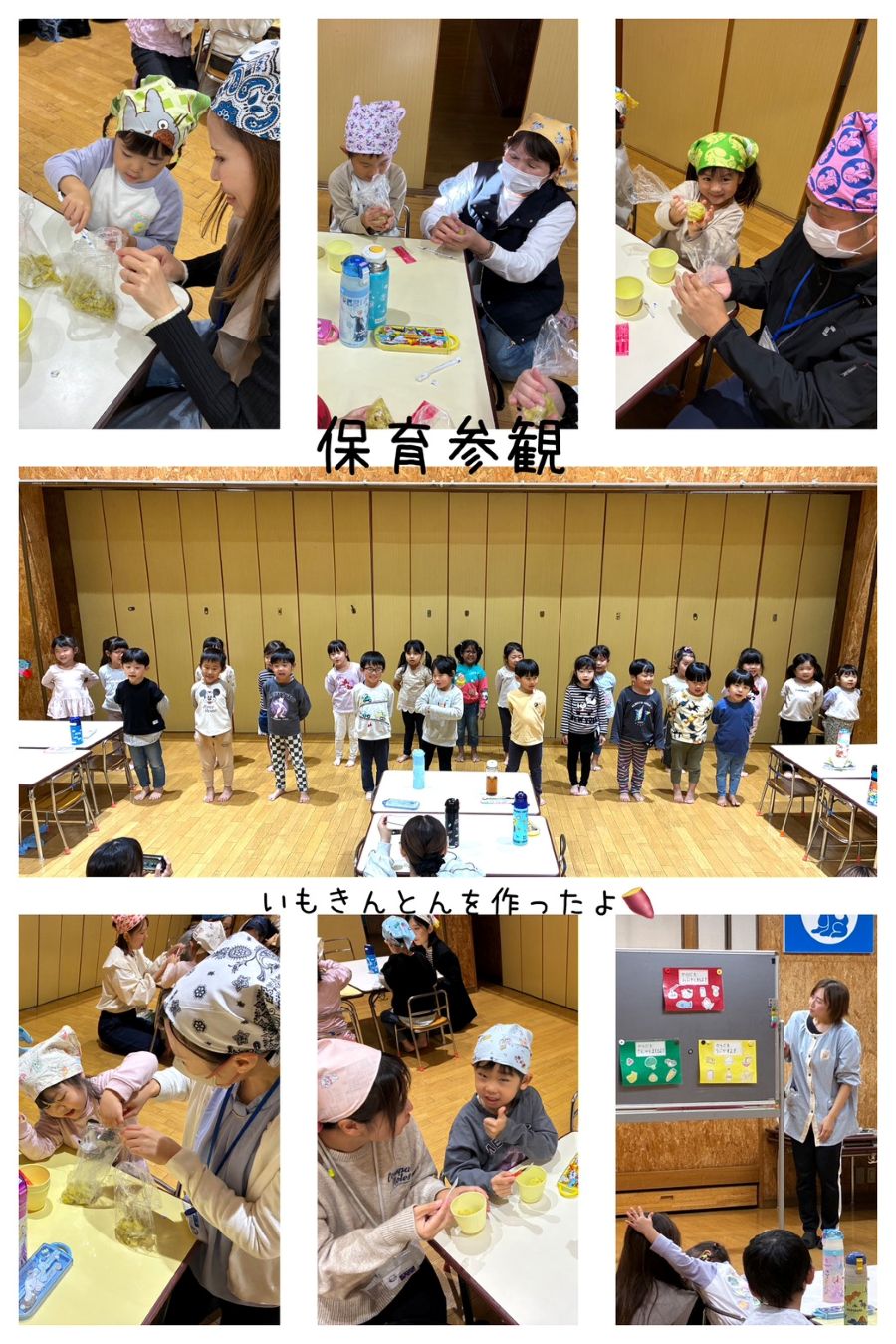 青組は、保育園で採れた芋を使って、芋きんとんを作りました。食の三原色を学びながら、砂糖を入れて、形を作り、食べました。「美味しいね」と保護者の方と楽しくクッキングができました。