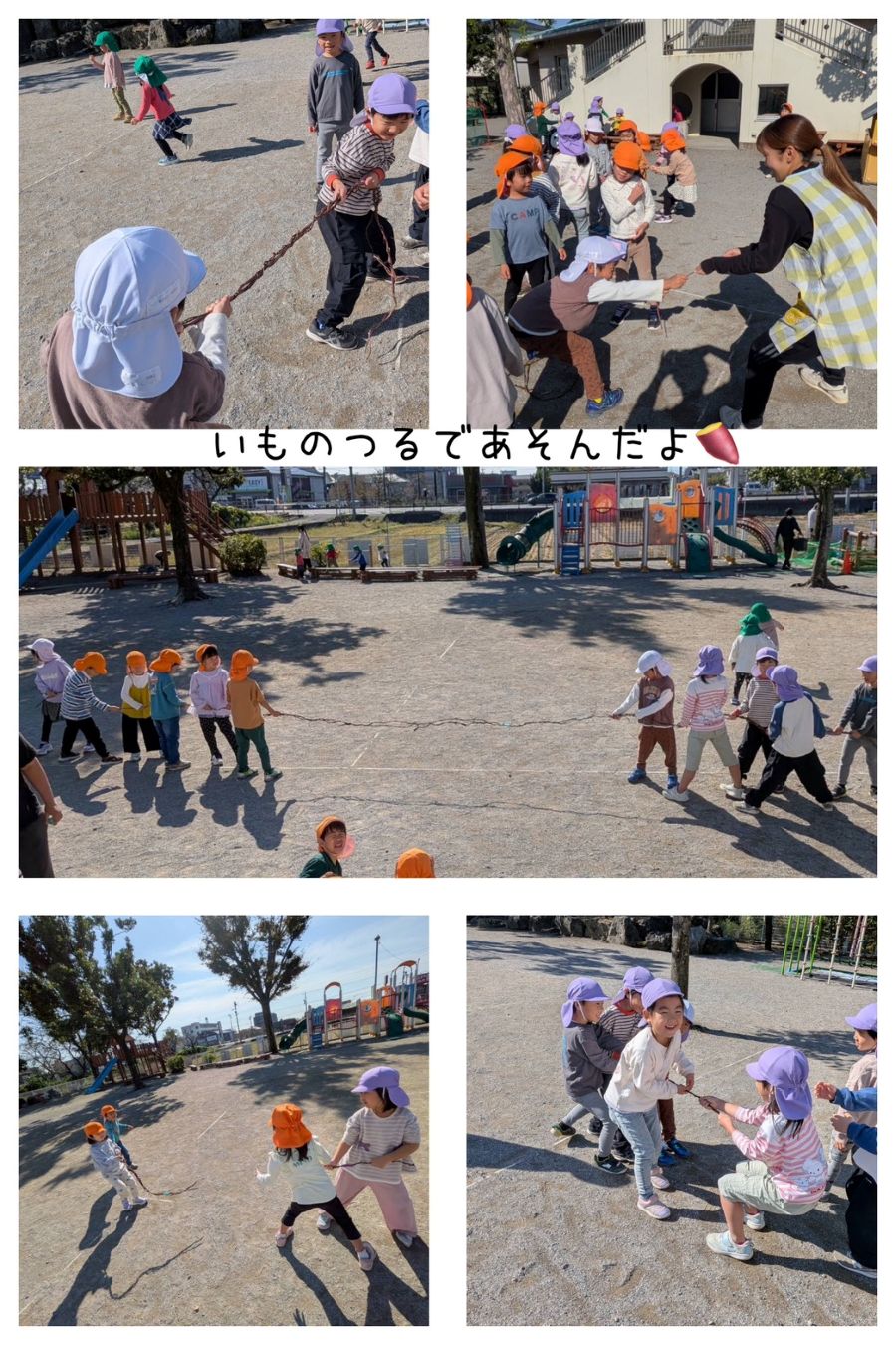 5歳児さんは、さつまいものツルを使って、大繩をしたり、綱引きをしました。芋のツルを編むところから行いました。大繩では、何回飛べるか挑戦してみたり、綱引きで、力比べをして、芋ほりから、ツルで遊ぶとお芋で楽しむことができました。