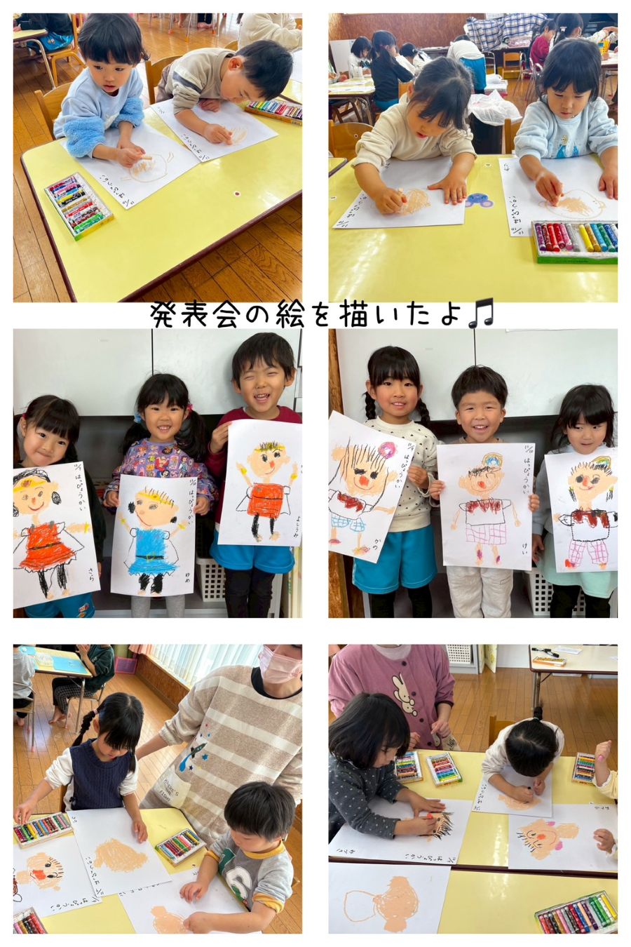 3歳児さんは、発表会の絵を描きました。どんな衣装で踊ったか、衣装を見ながら描きました。「この色かな?」「次は目・口を描こう!」と、楽しく描くことができました。上手に描けたよと嬉しそうに見せてくれました。