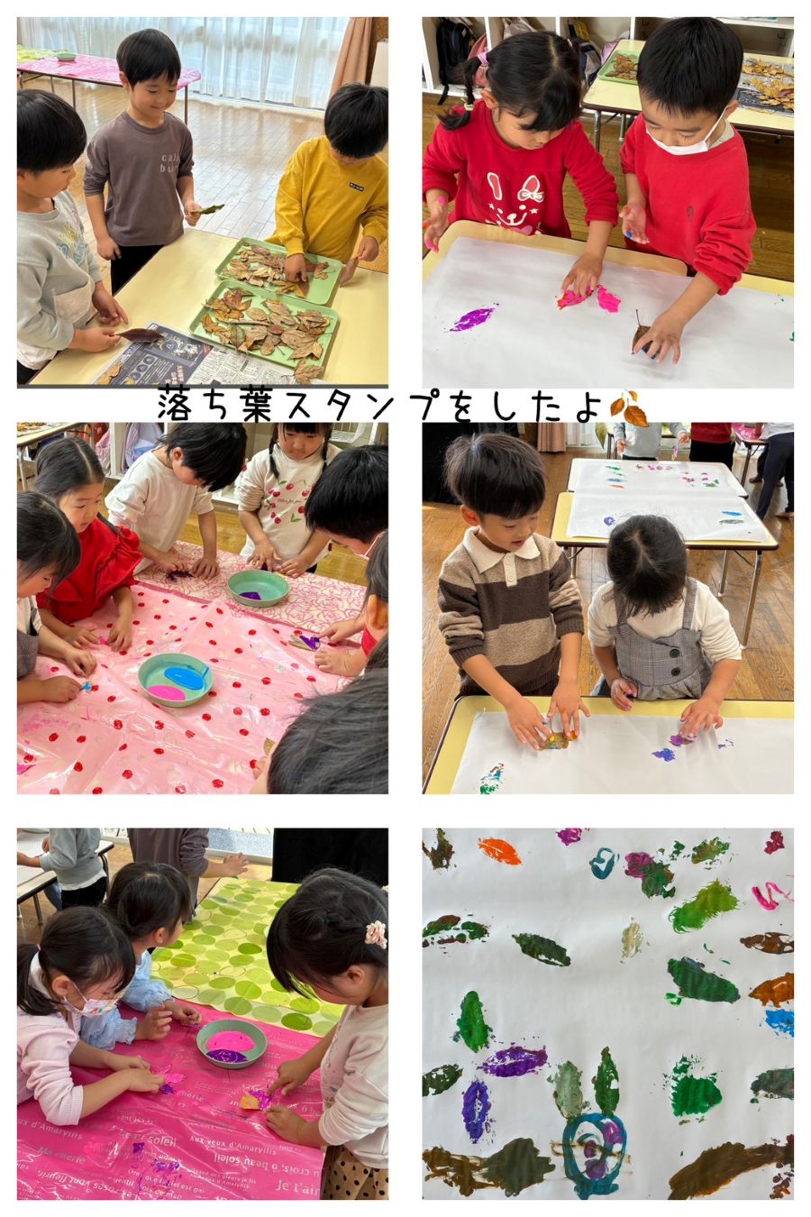 4歳児さんは、木の実や、葉っぱを使って遊びました。青組はどんぐりや、松ぼっくりを使い、カップケーキを作りました。「何味にしようかな?」「どんなものをのせようかな?」と考えながら楽しく作りました。みんなで作った物を並べて、ケーキ屋さんの開店です。 白組は、葉っぱに絵の具絵を付けて、スタンプをしました。指で葉っぱに色を塗り、ペタン!きれいに葉っぱの形になりました。葉っぱを組み合わせてハートや、ウサギなどの絵も作っていましたよ。