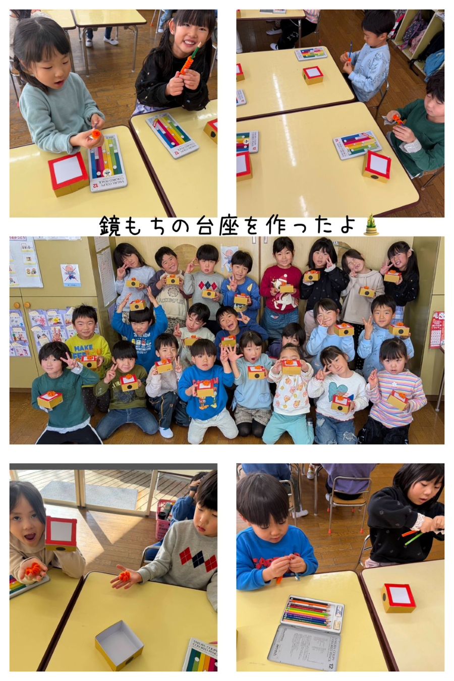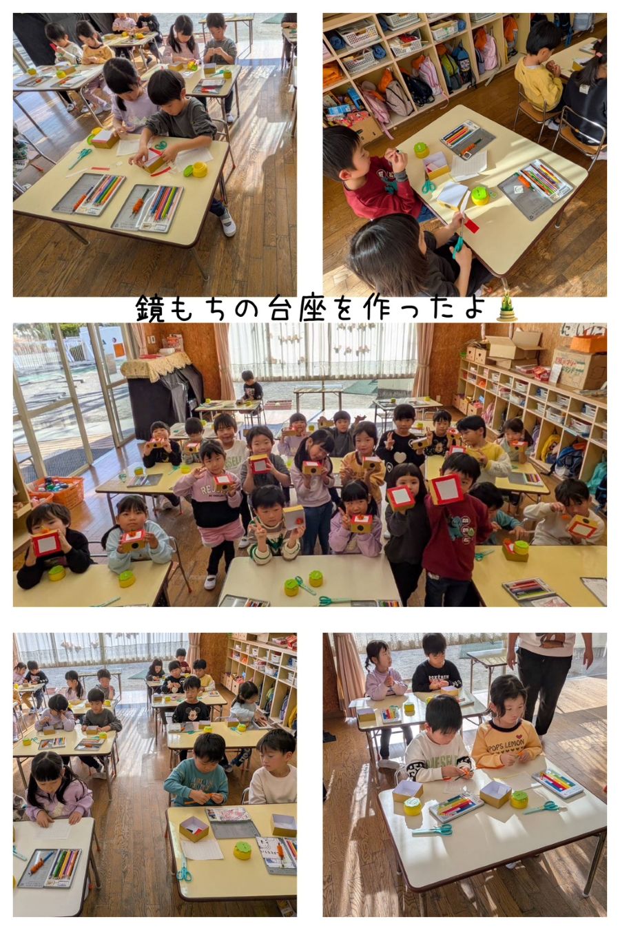5歳児さんは、来週のもちつきで作る鏡もちの台座を作りました。もちつきについて話を聞いたり、鏡餅の意味などを知りました。鏡餅の上に乗せる橙を、鉛筆にモールを巻いて、作りました。来週に楽しくもちつきをして、お正月について学べるといいですね。