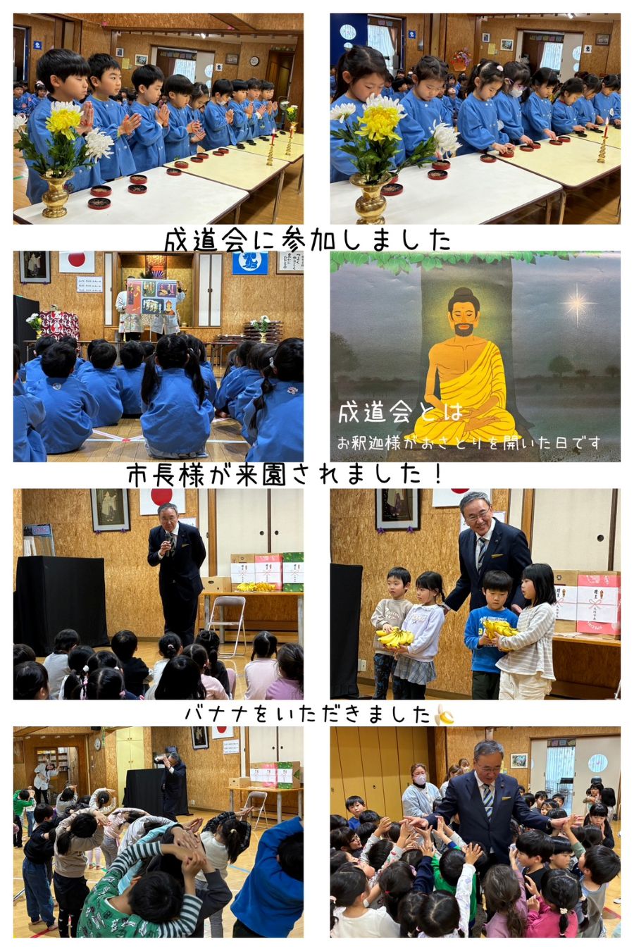 成道会を行いました。お釈迦様がお悟りを開かれた日ということを知り、紙芝居を通してお釈迦様の教えを学びました。優しい心をもって、お友達と過ごしていきます。