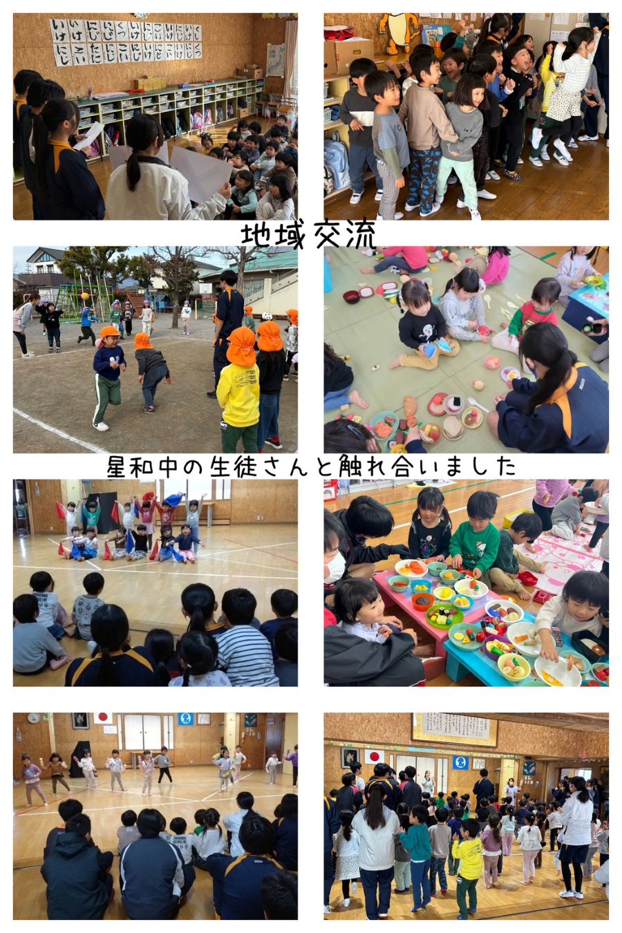 星和中学校の学生さんと地域交流をしました。紙芝居を読んでもらったり、クイズをして楽しみました。その後5歳児さんは、ドッジボールを行い、4歳児さんは、発表会で踊った踊りを見てもらいました。たくさん遊び、とっても良い思い出になりました。
