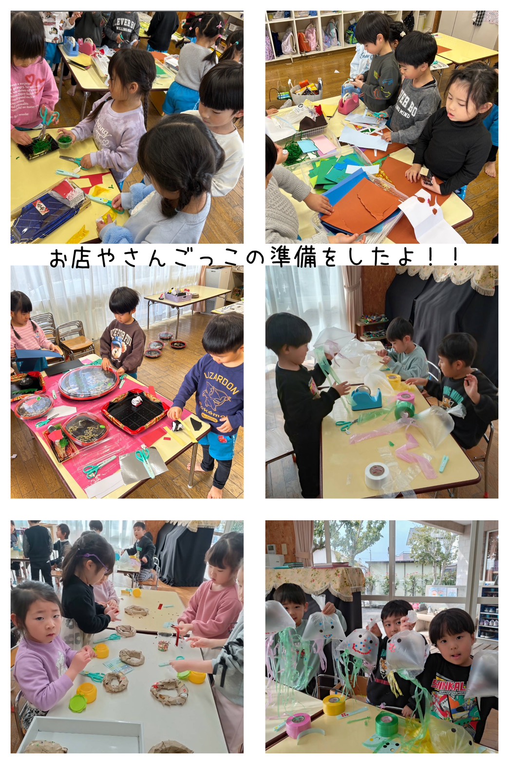 2月のお店屋さんweekに向けて、各クラスお店作りや、おもちゃ作りが始まりました。自分たちで、どんな絵を描こうか、どんなお店にしようか話ながら楽しく作っています。 おもちゃは、自分たちでも遊んでみて、回ったり、飛び出たりと、楽しく遊んでいますよ。お店屋さん当日には、たくさんのお客さんに買ってもらえるね。