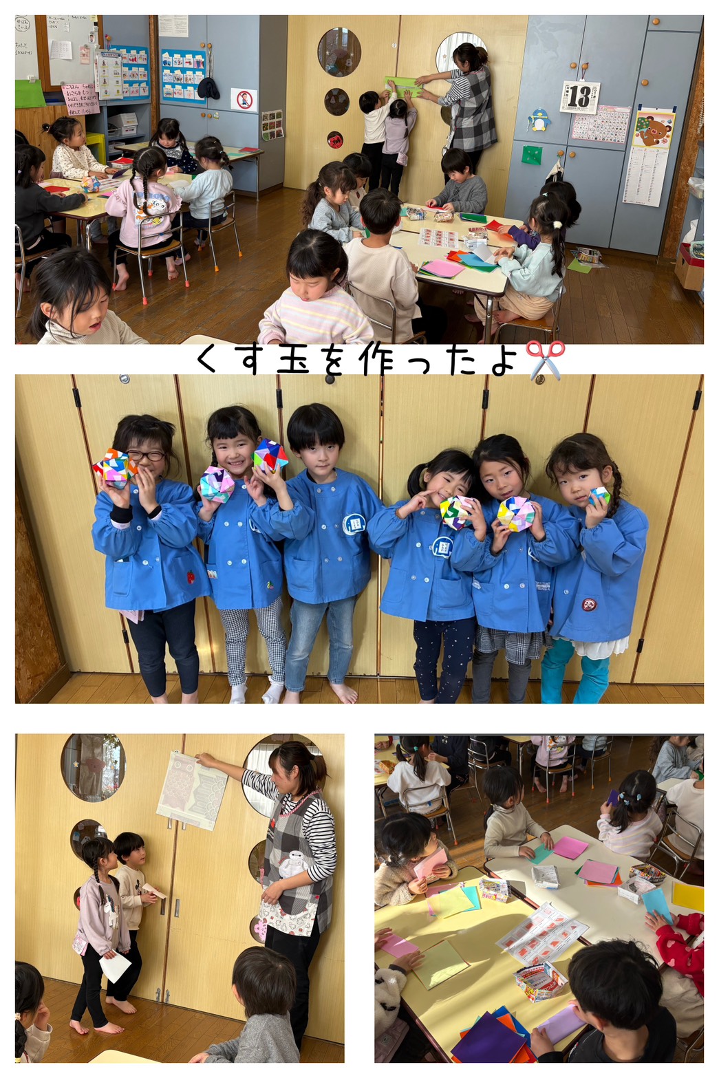 自由あそびの時間にくす玉教室が行われました。子供が家庭で作ってきたものを見て、作りたいとなり、保育士や、作れる子が先生となり教えてくれました。やってみると大変であきらめそうな子もいましたが教えてもらいながらみんなで楽しく作ることができました。出来たものをみると満足そうでしたよ。