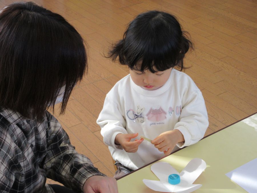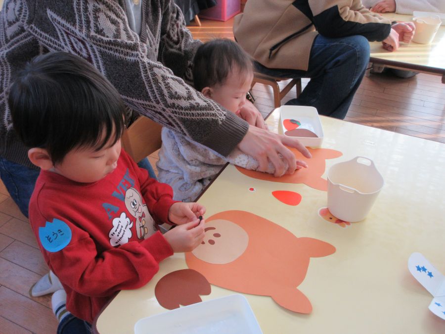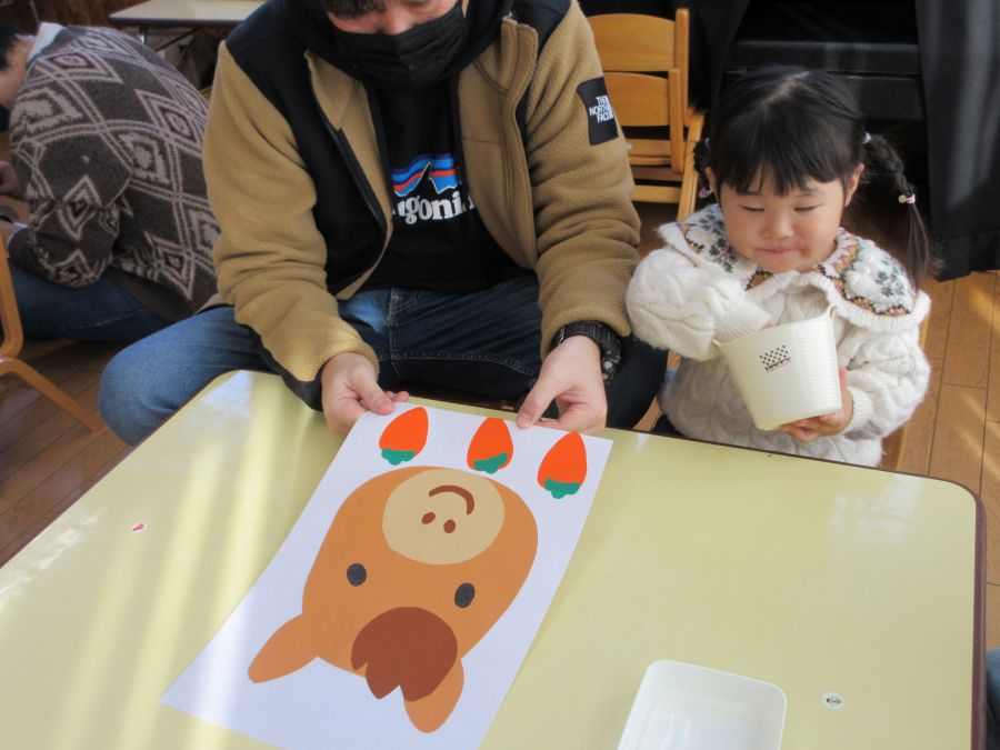 2026年01月21日(水) 第9回にこにこわんちゃんクラブを開催しました。 にこにこワンちゃんクラブを行いました。 今回は、正月遊びをしました。今年の干支の馬の福笑いや、コマを作りました。シールで飾り付けをしたり、目や人参を貼ったり、家族の人と楽しく作ることができました。作ったコマで遊んだり、保育園にあるコマに挑戦してみたり、楽しく遊びました。 もどる