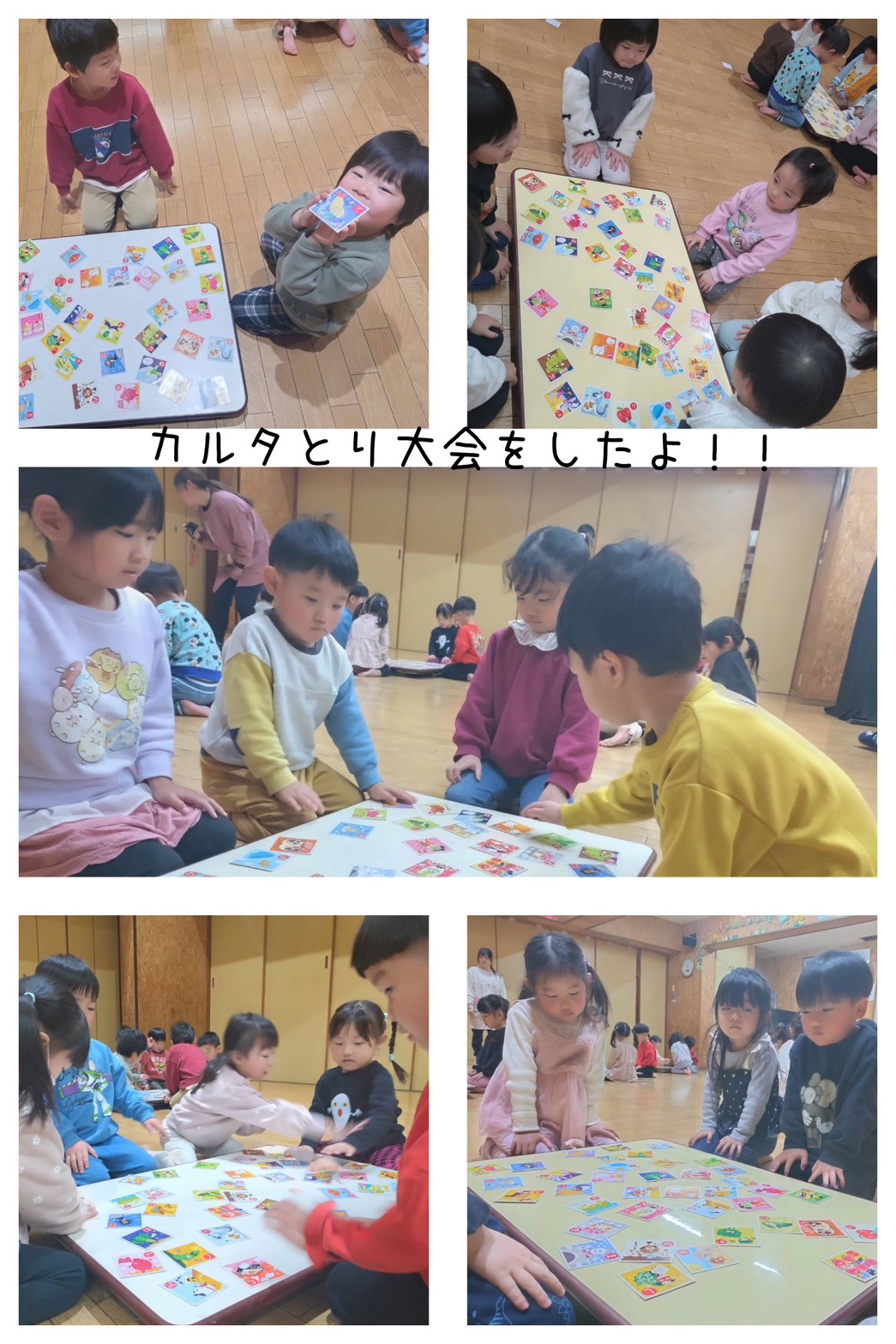 緑組・紫組は、カルタ大会を行いました。部屋でも練習をしてきて、読み札を聞きながらさっと取れる子が増えてきました。取るときには、「はい!」と大きな声で絵札を取っていましたよ。取れた札を友だちと見せ合ったり、先生に見せたり、嬉しそうでした。 たくさん取れたお友達には、メダルがもらえました。また、来年も挑戦しようね。
