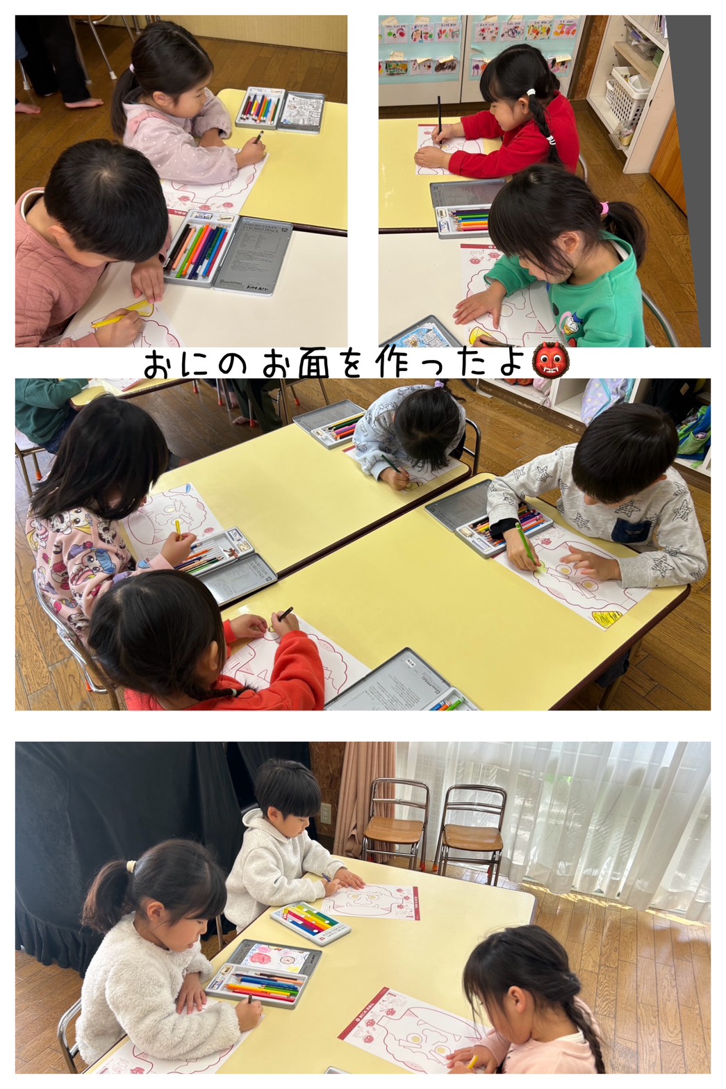 白組は節分に向けて、鬼のお面を作りました。何色の鬼にしようか楽しく話ながら、作ることができました。節分について、話を聞きながら、豆まきの歌も歌いました。