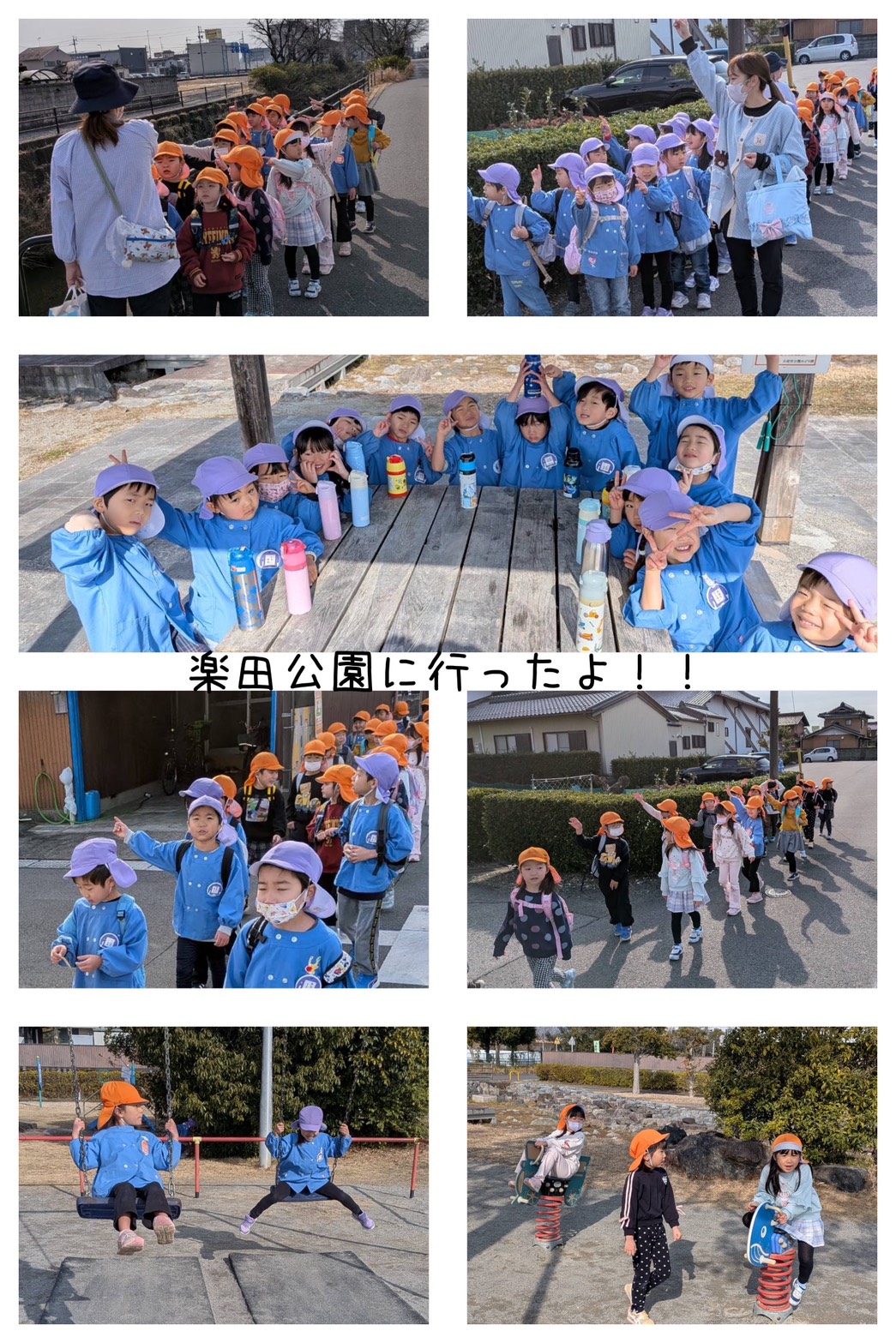 橙組、藤組で一緒に楽田公園まで、散歩に行きました。横断歩道を渡るときには、きちんと左右確認をして、交通ルールを守って安全に歩くことができます。 公園では、鬼ごっこをしたり、草花や、生き物を見つけたり、遊具で、友達と一緒に仲良く遊んでいました。帰り際まで思いっきり体を動かし、楽しく過ごすことができました。