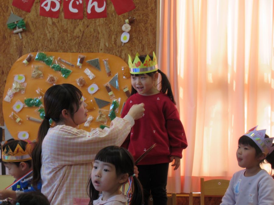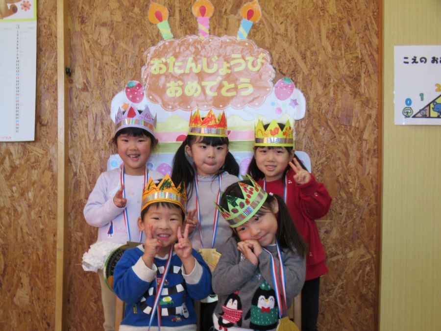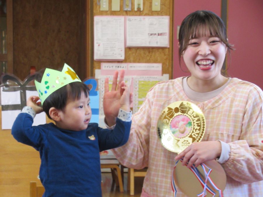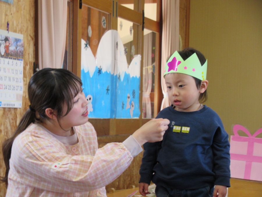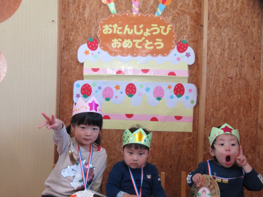 2026年02月17日(火) 2月生まれの誕生会(未満児・3歳児) 2月生まれのお友達 お誕生日おめでとう!! 先生からのプレゼントで、プレゼントボックスから動物や、ケーキが出てきました。ピンクの箱からは何が出てくるか当てたりしながら楽しく見ることができました。 誕生日の子は、恥ずかしがりながらもインタビューに答えることができました。絵本のプレゼントをもらいみんなから、お祝いしてもらい、大きくなったことを喜び合いました。 もどる